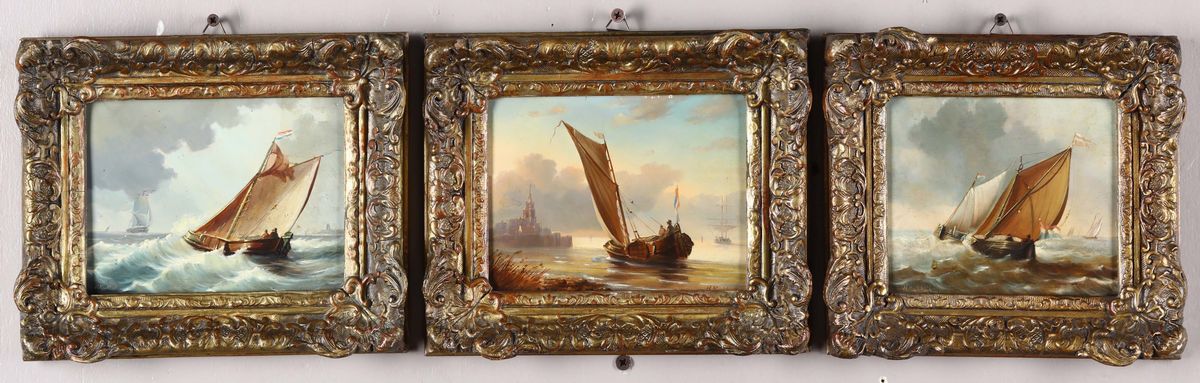 Lotto di tre “Marine”, olio su tavoletta, firmati: H. Koekkoek, cm 13,5x17,5 (circa) cadauna