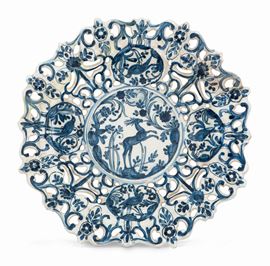 Maiolica monocroma a gran fuoco foggiata a stampo e traforata con raffigurazione di cervo al centro del cavetto e uccelli entro riserve sulla tesa, marca Sole al verso, diametro cm 30 (restauri)