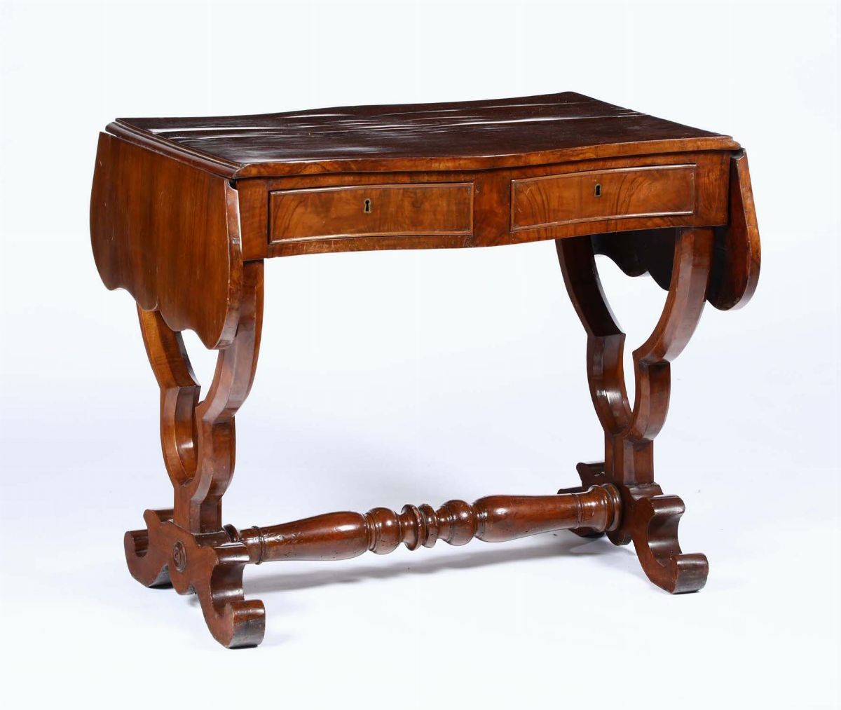 piano sagomato, due cassetti sulla fascia, montanti riuniti da traversa tornita, cm134x68x76