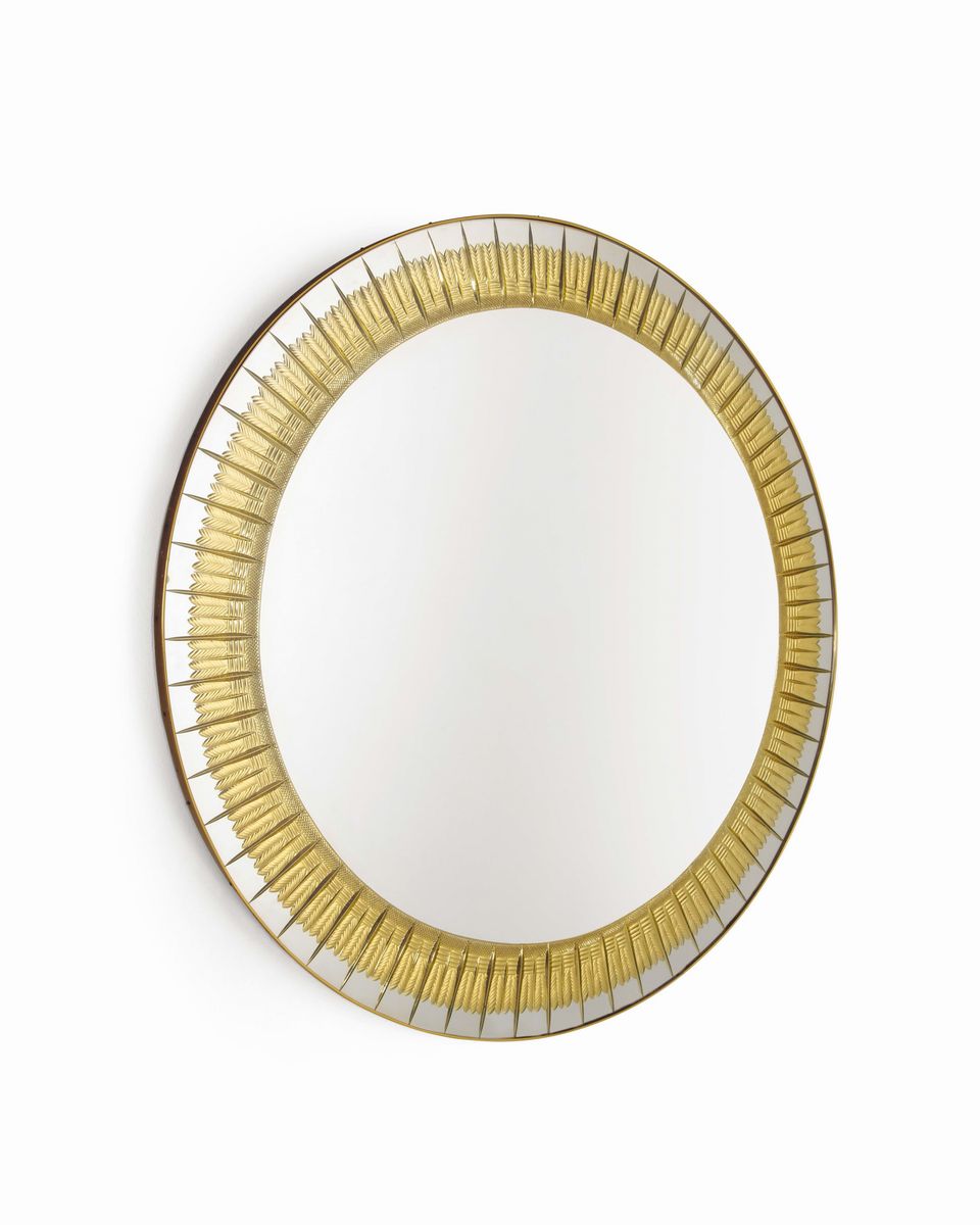 Specchiera con struttura in legno e decoro dorato in vetro. Dettagli in ottone.Prod. Cristal Art, Italia, 1960 ca.cm 2x100