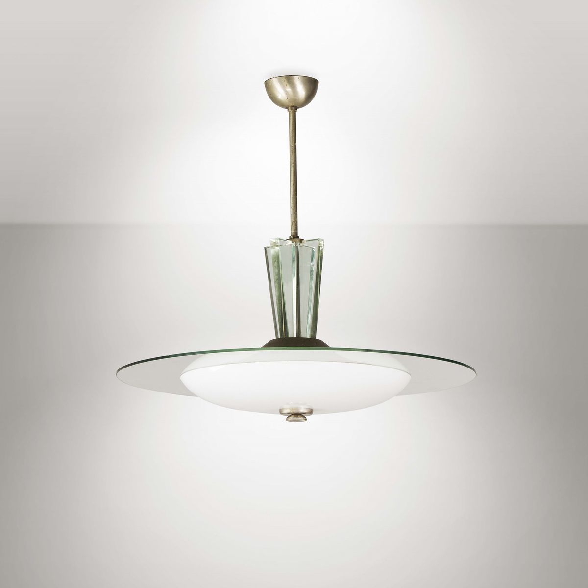 Lampada a sospensione con struttura in ottone nichelato con elementi in vetro molato. Diffusori in vetro colorato curvato e molato ed in vetro satinato. Prod. Fontana Arte, Italia, 1950 ca. cm 65x65