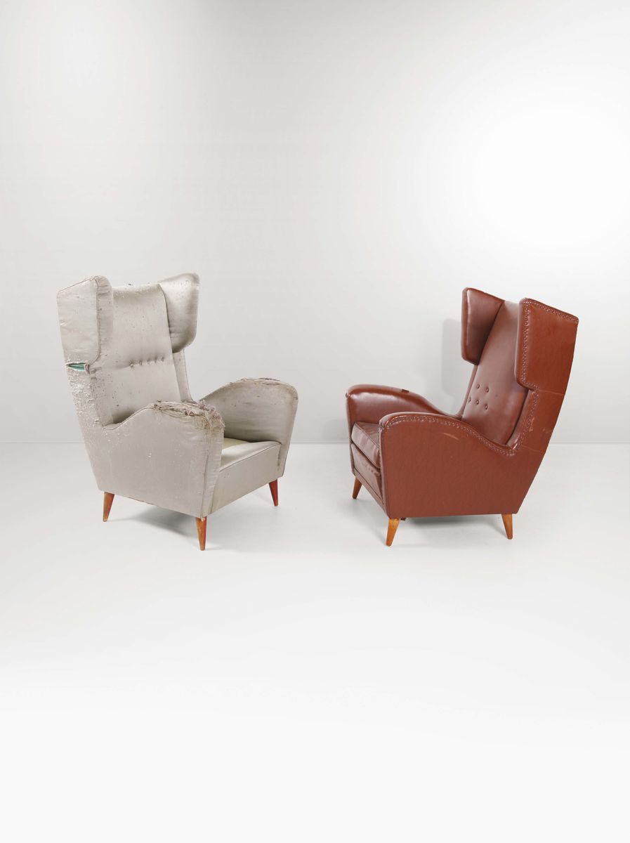 Due poltrone con struttura in legno e rivestimenti in tessuto e skai. Prod. Italia, 1950 ca. cm 69x100x78