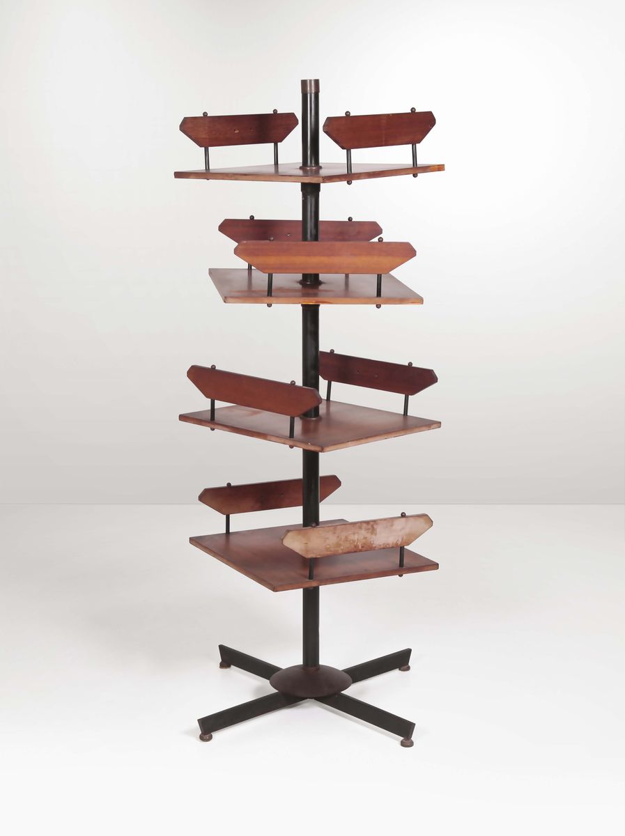 Libreria girevole con struttura in metallo laccato e piani in legno. Dettagli in metallo. Prod. Italia, 1950 ca. cm 155x70