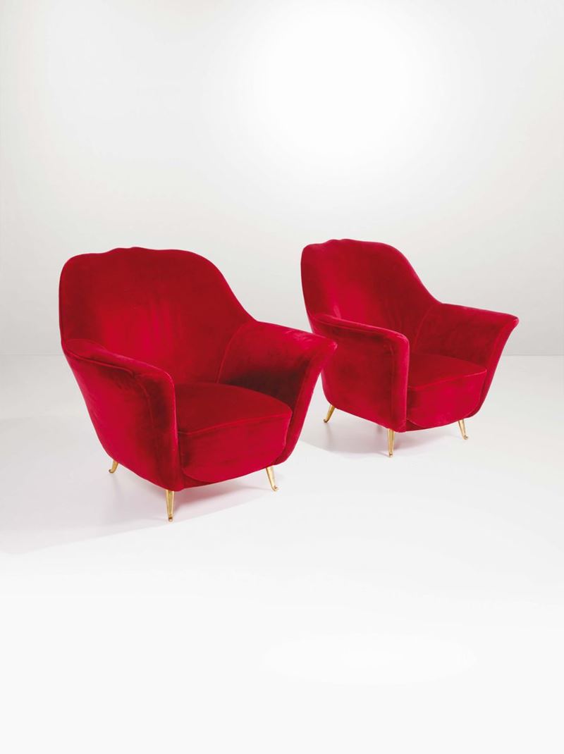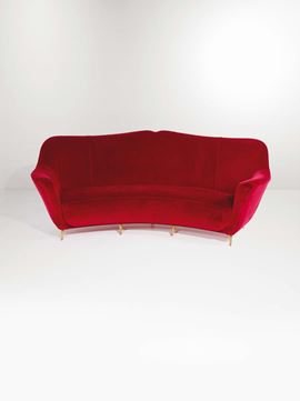 Salotto composto da un divano e due poltrone con struttura in legno, rivestimento in tessuto e supporti in ottone. Prod. Isa, Italia, 1950 ca. Divano: cm 213x85x82; Poltrone cm 86x89x82