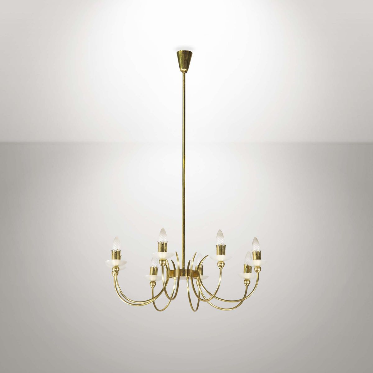 Lampada a sospensione con struttura in ottone e ottone laccato.