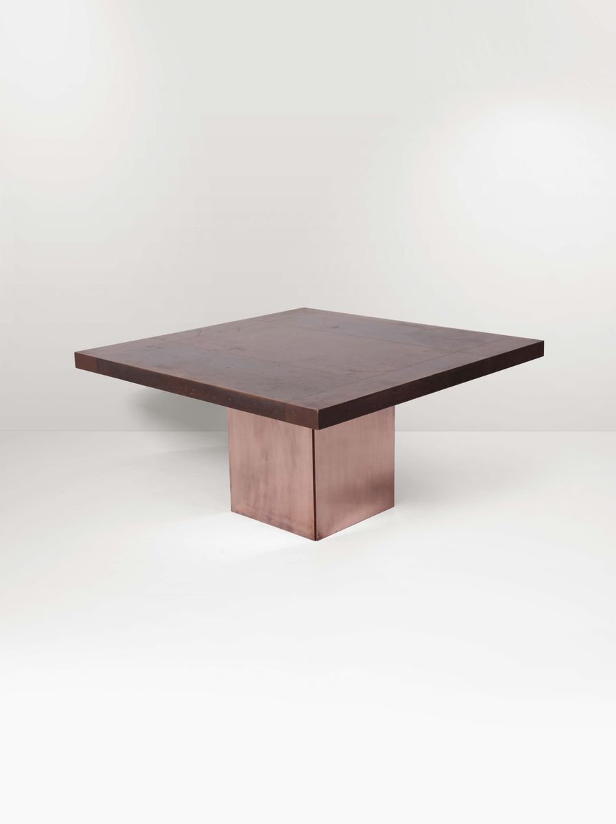Raro tavolo con base in fusione di alluminio, rivestimenti in rame e piano in rame rivettato. Firma incussa. Prod. Burchiellaro, Italia, 1970 ca. cm 140x73x140