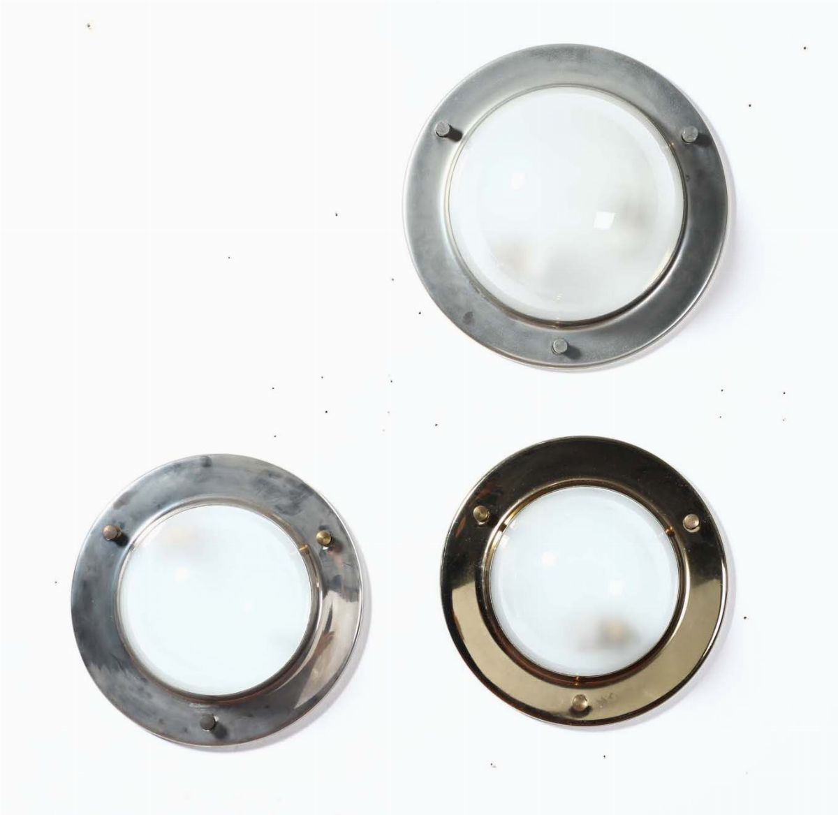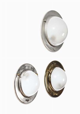 Tre appliques LSP6 in ottone cromato e vetro opalino. Prod. Azucena, Italia, 1960 ca. Coppia: cm 30x10; Singola: cm 35x12