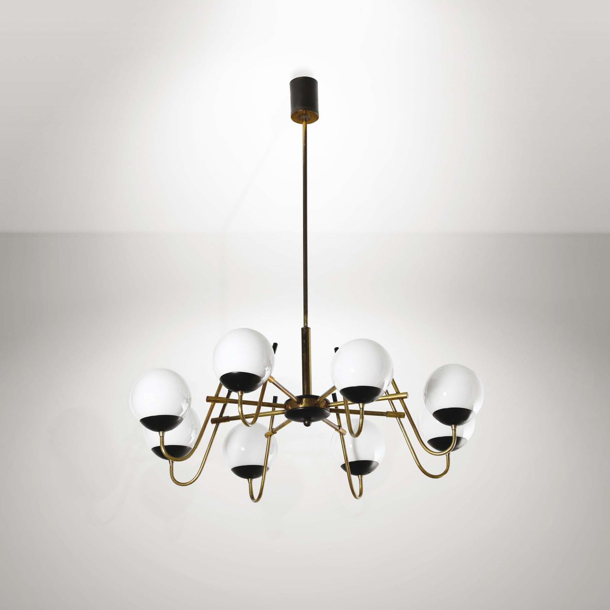 Lampada a sospensione con struttura in metallo laccato e ottone e diffusori in vetro opalino.Prod. Italia, 1950 ca.cm 90x75