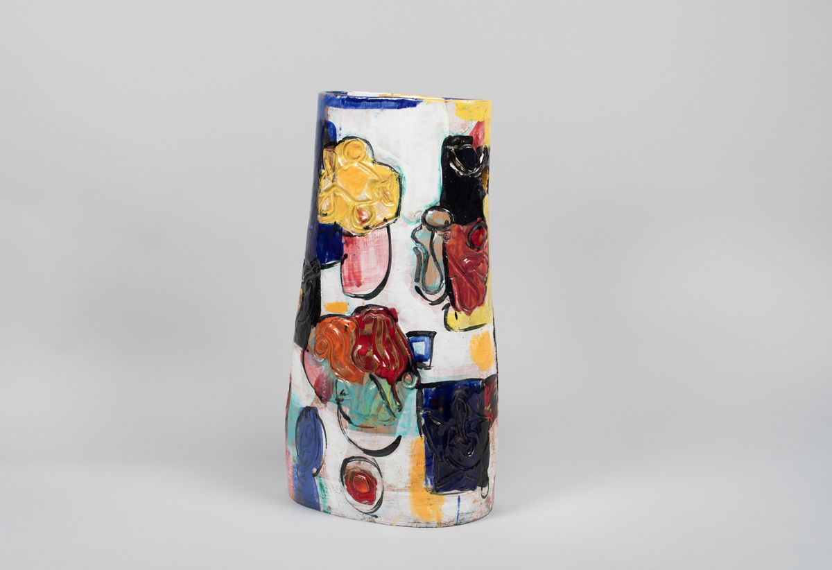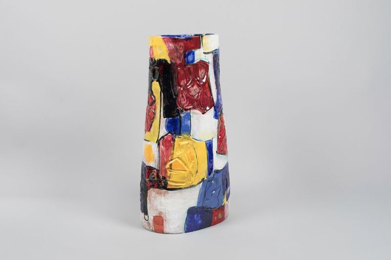 Vaso portaombrelli in terracotta maiolicata con decoro policromo astratto.