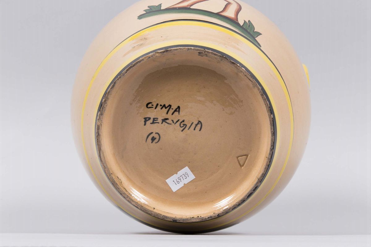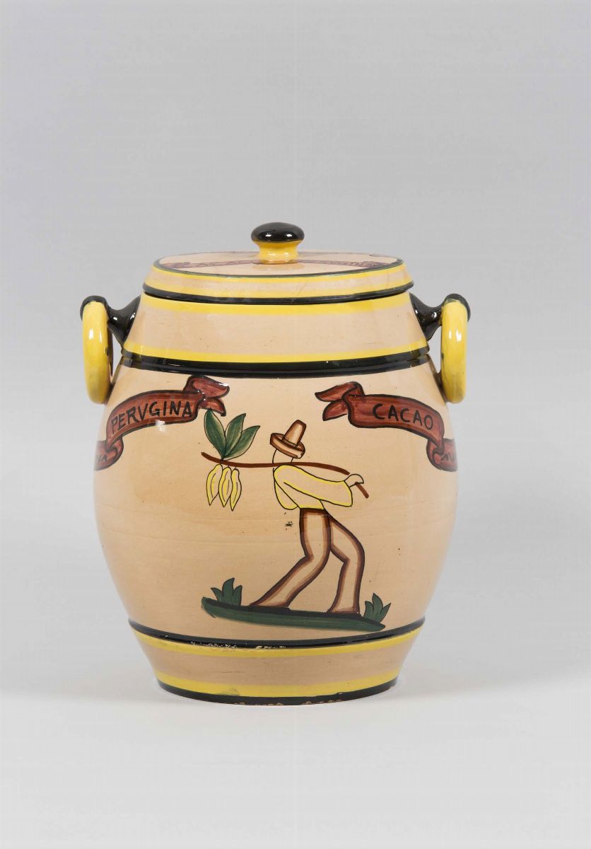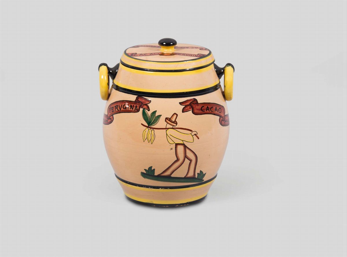 Vaso in terracotta pubblicitario con coperchio e manici applicati con decoro policromo di portatori di cacao.