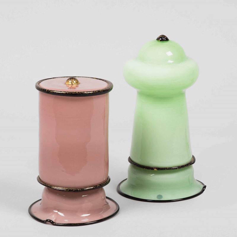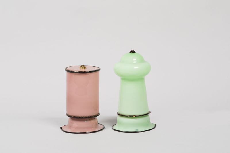 Due velleuses in vetro opalino con fili neri applicati e foglia oro.