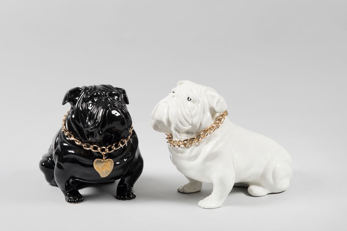 Coppia di cani in terraglia a colaggio con collari in ottone dorato.