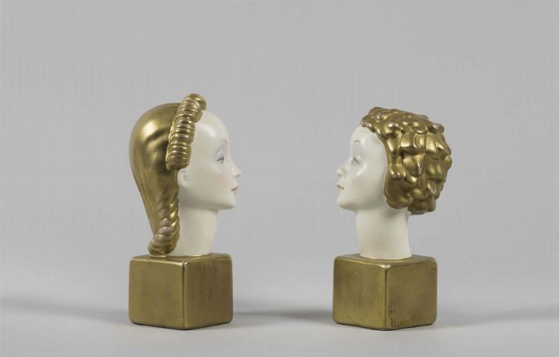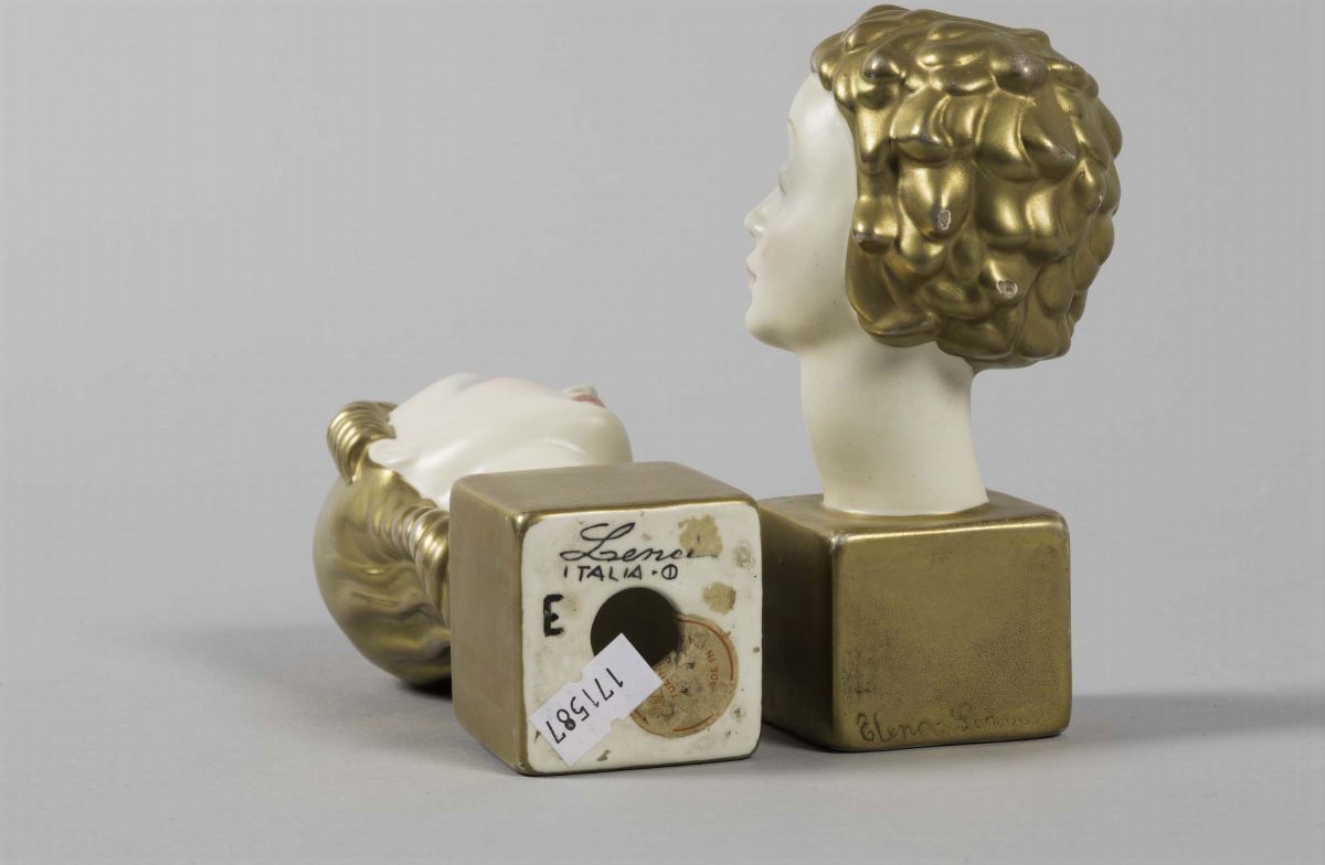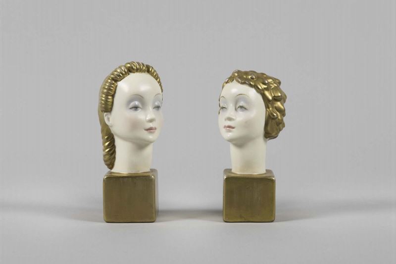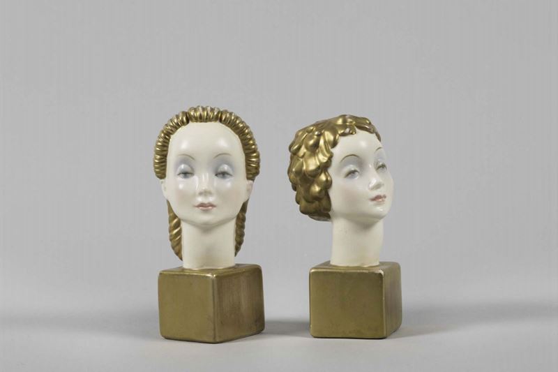 Lotto composto da due teste su basamento quadrato in terraglia modellata raffiguranti la dea Calipso e testa di fanciullo.