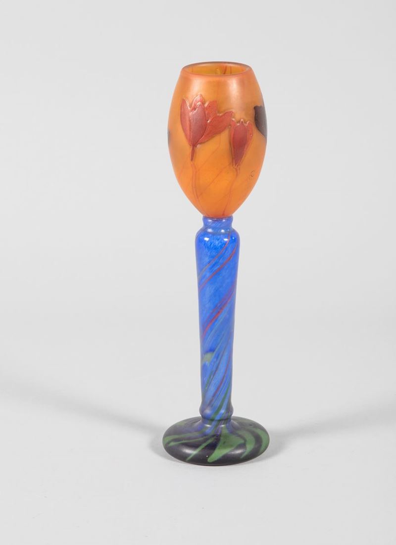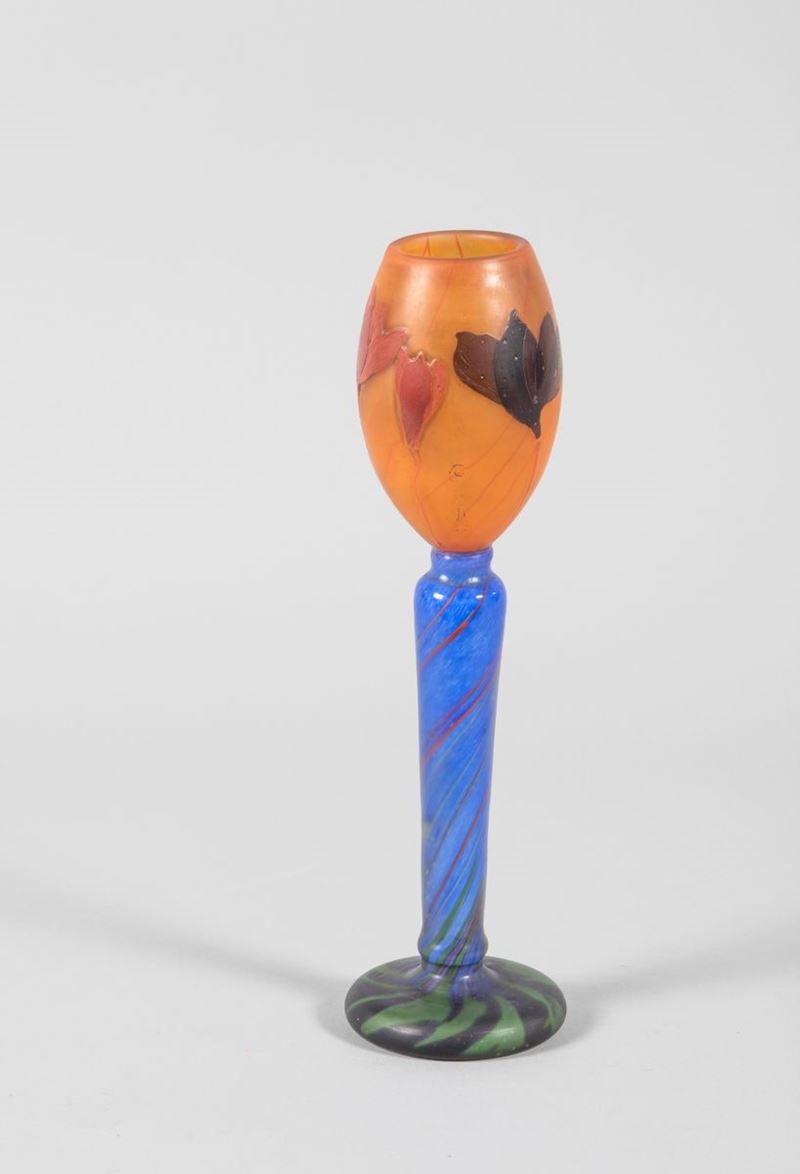 Importante vaso in pasta vitrea arancione con decoro a marquetterie di fiori rifiniti alla mola su alto stelo in pasta vitrea blu con decoro di fili policromi.