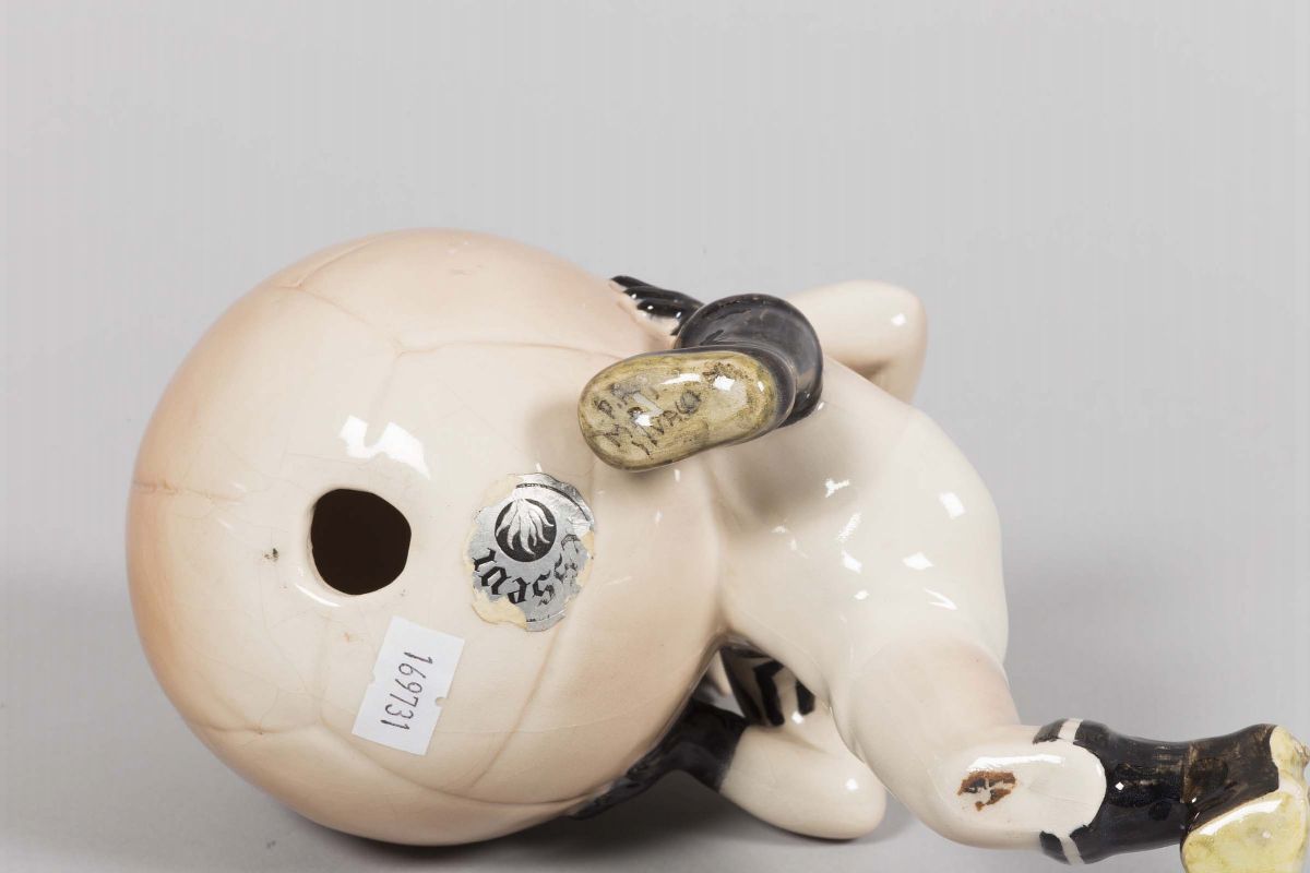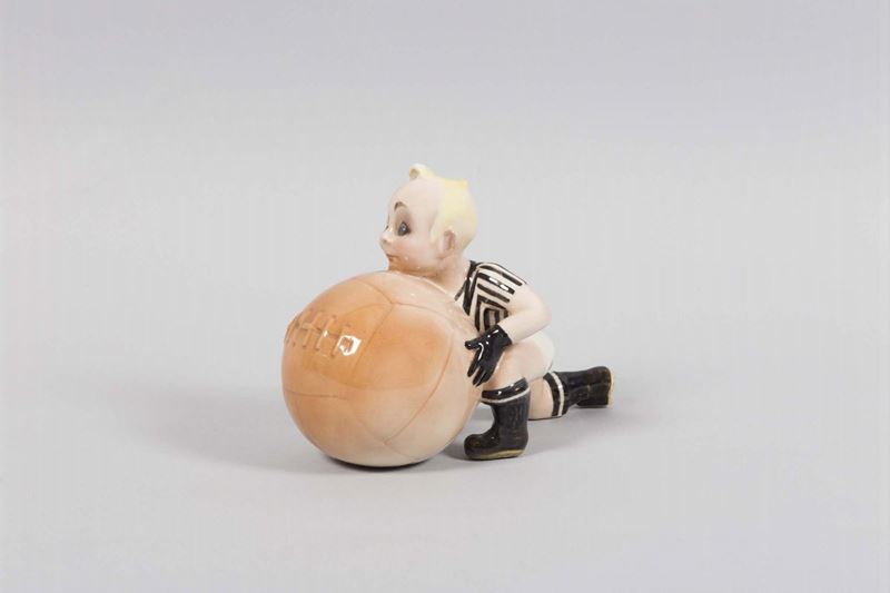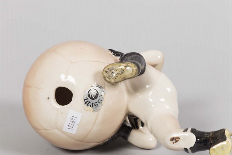 Giocatore con pallone gigante in terraglia a colaggio decorata in policromia.