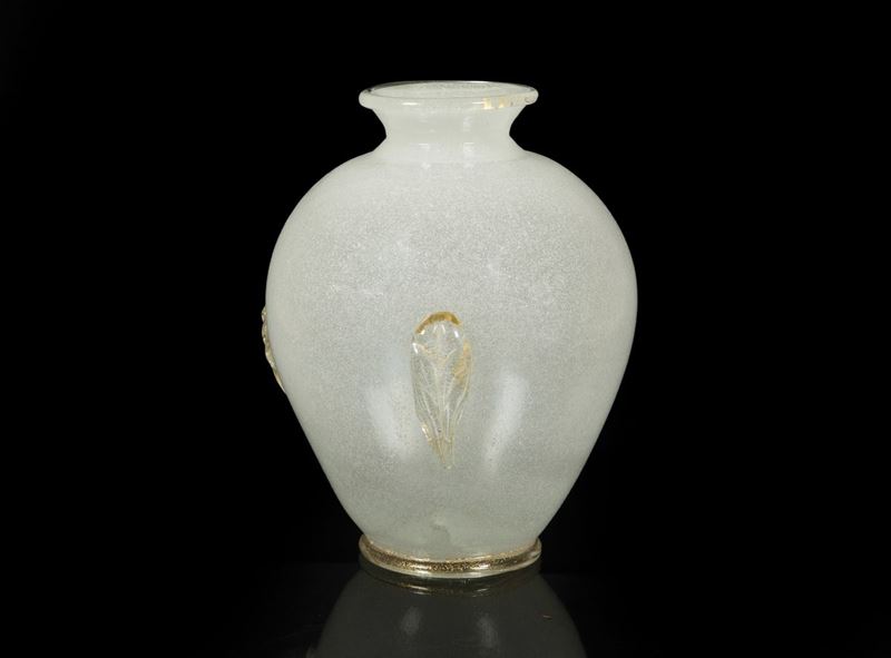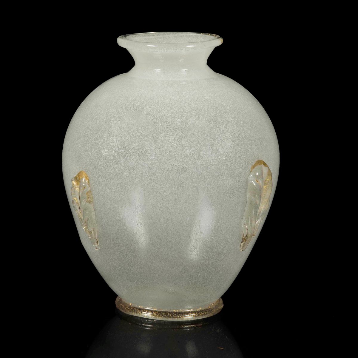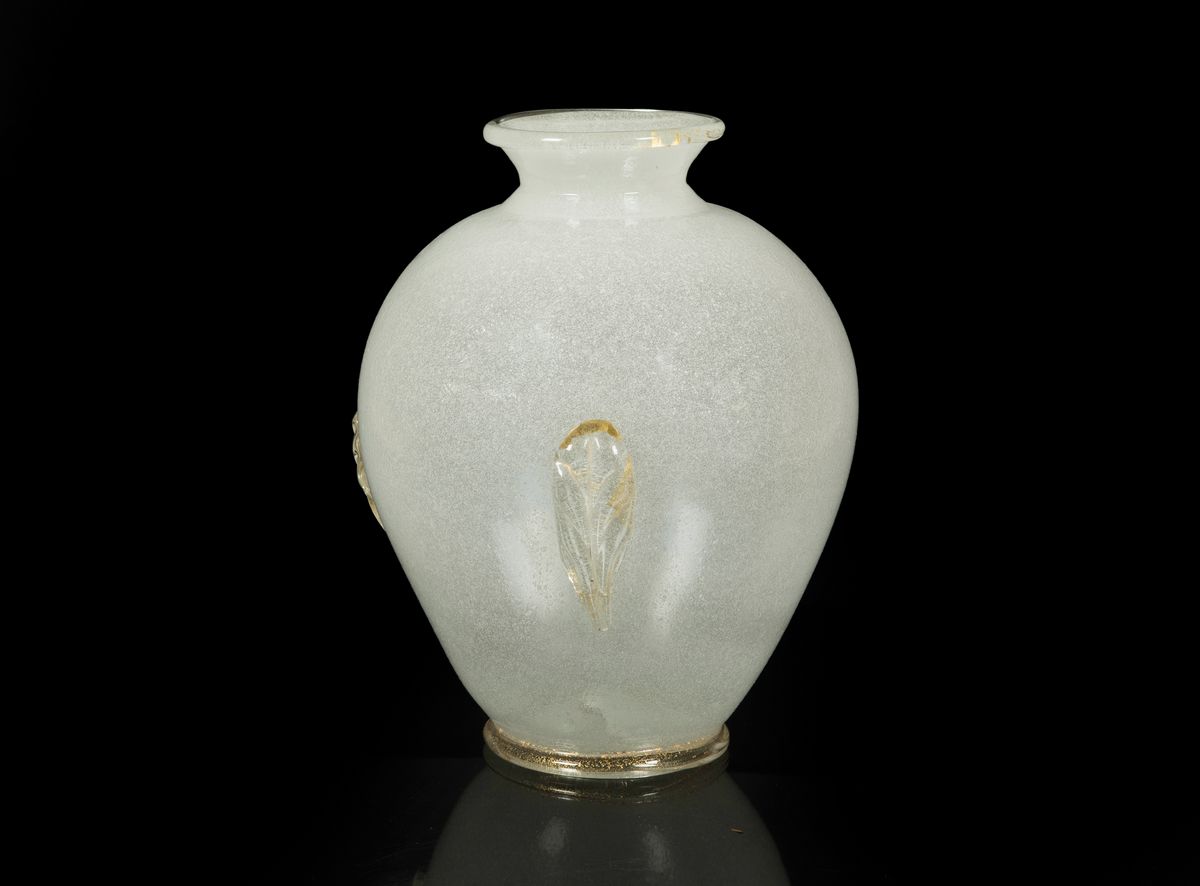 Grande vaso a uovo in vetro pulegoso bianco con applicazioni e cordolo in vetro trasparente con foglia oro.