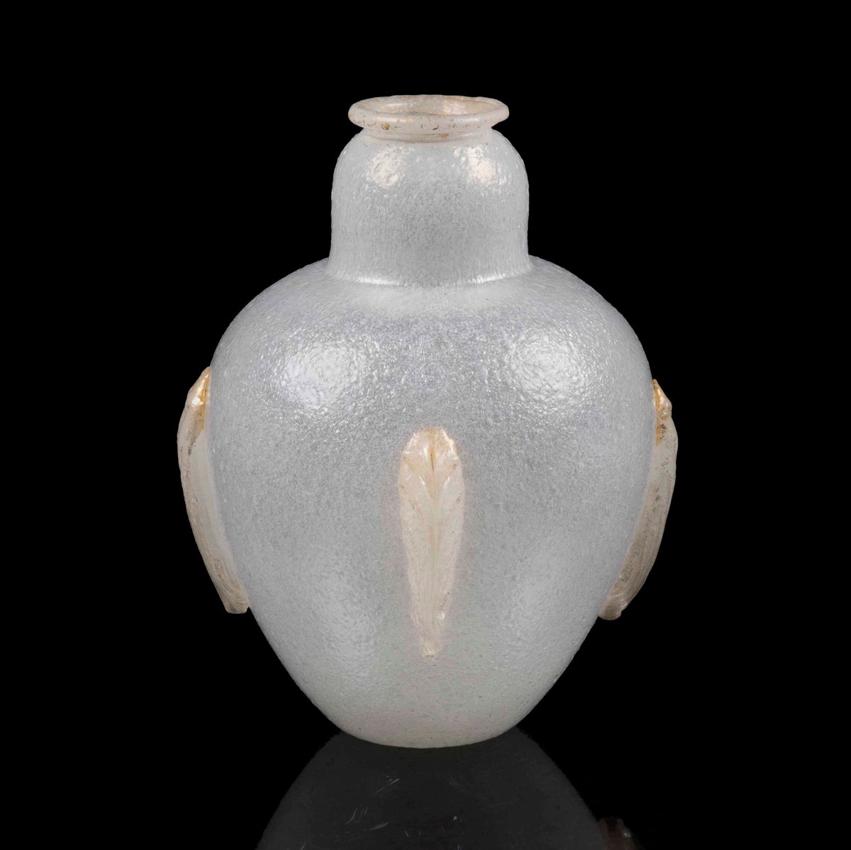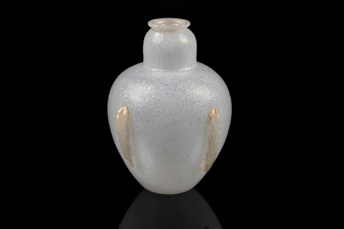 Vaso a uovo in vetro pulegoso con applicazioni a foglia e bocca decorati in foglia oro. Superficie fortemente iridata.