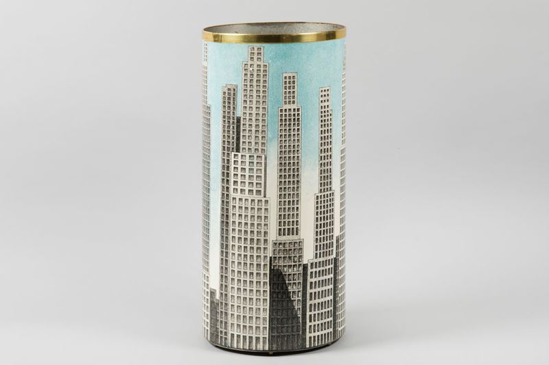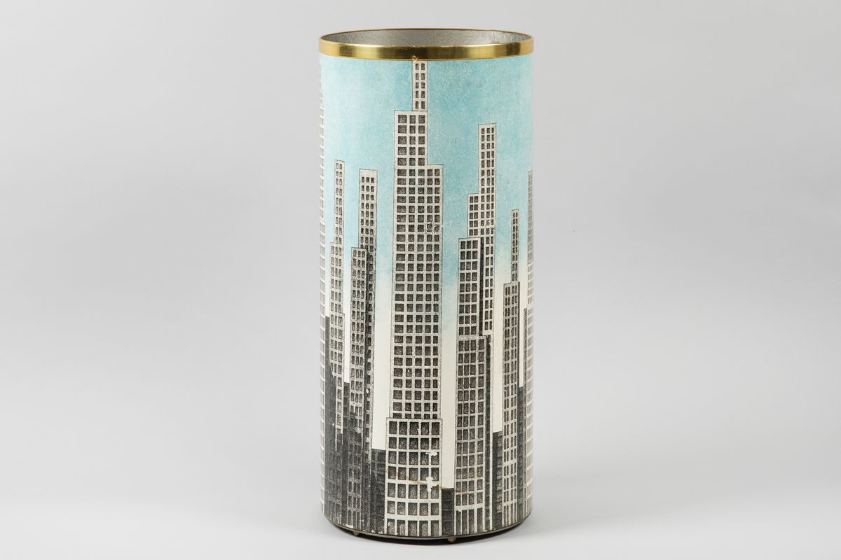 Portaombrelli cilindrico in metallo con decoro di grattacieli. Fascia in ottone.
