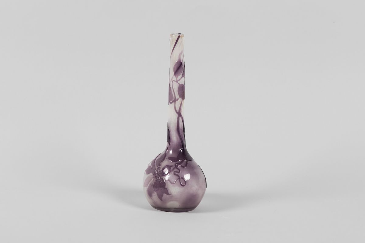 Grande vaso a bulbo con alto collo in vetro a cammeo lucido con decoro floreale.