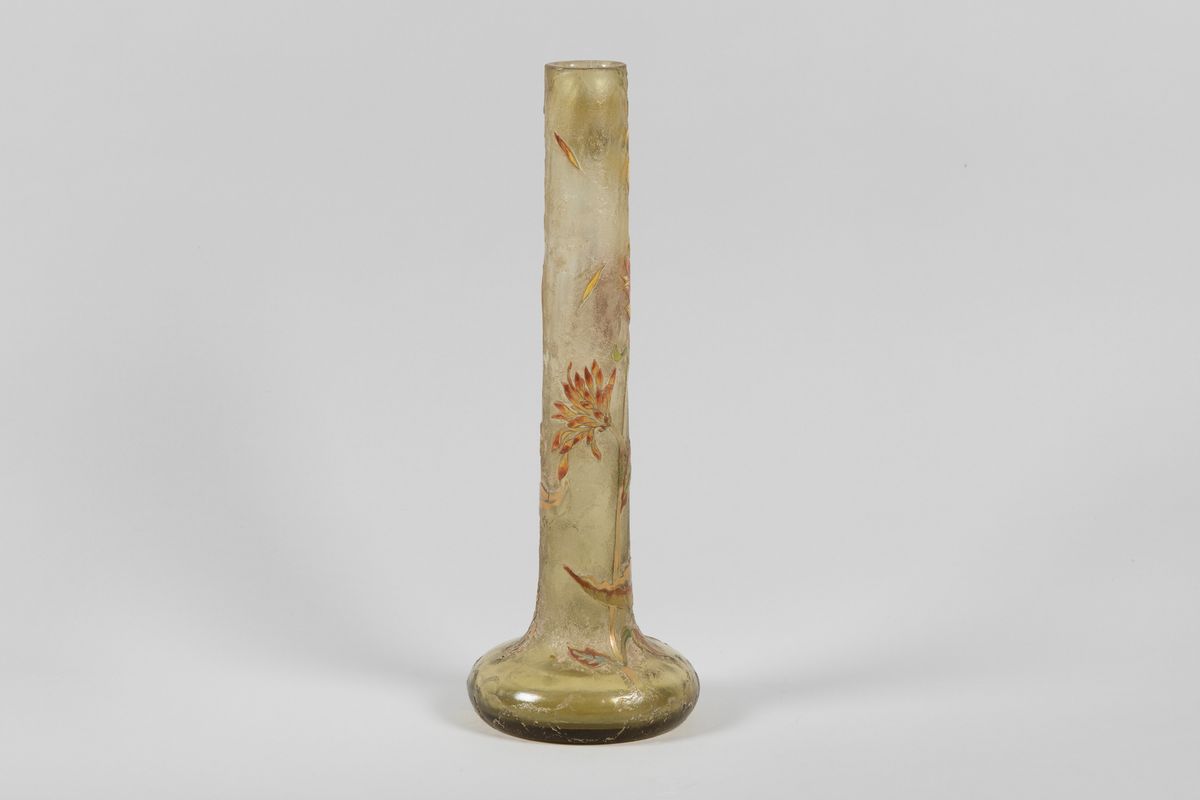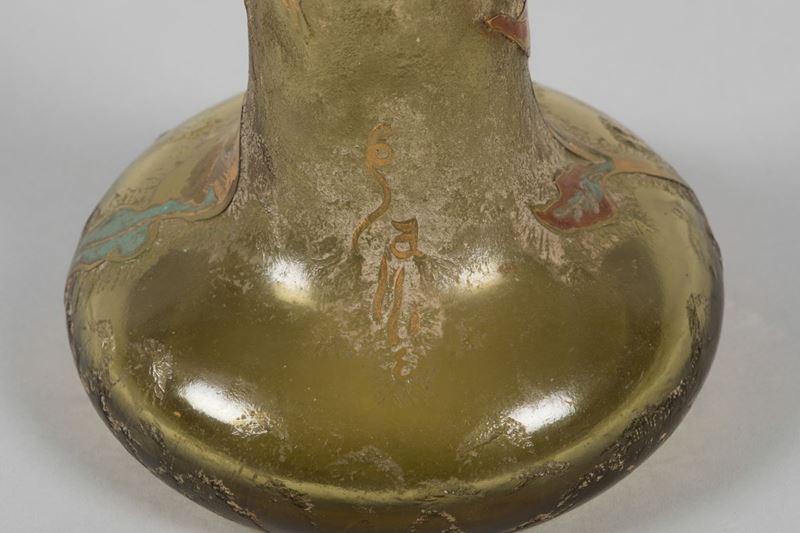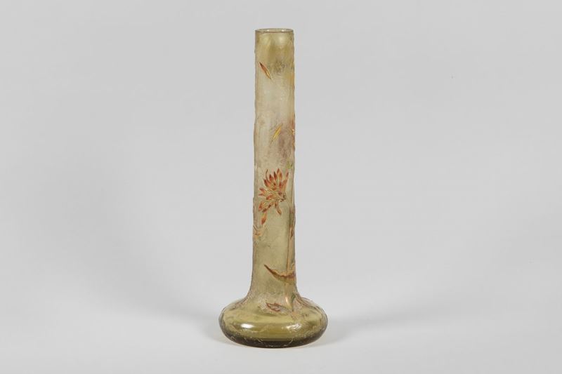 Grande e raro vaso a clava in vetro soffiato a cammeo con decoro floreale a smalto e dorature.