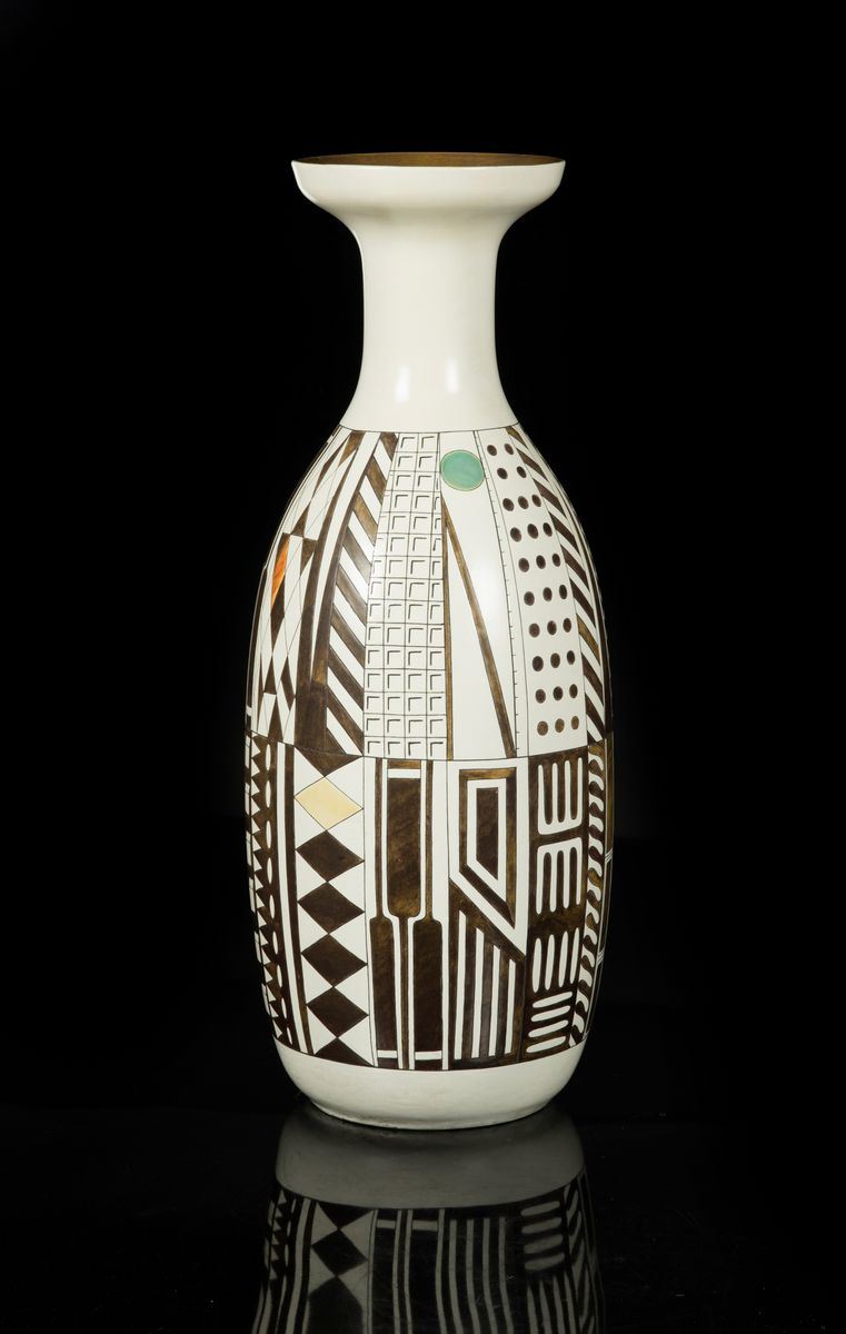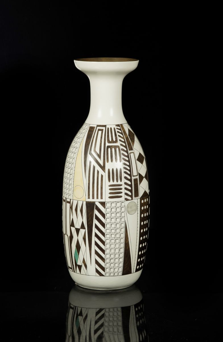 Eccezionale vaso in terraglia con decoro astratto inciso e a smalti policromi.