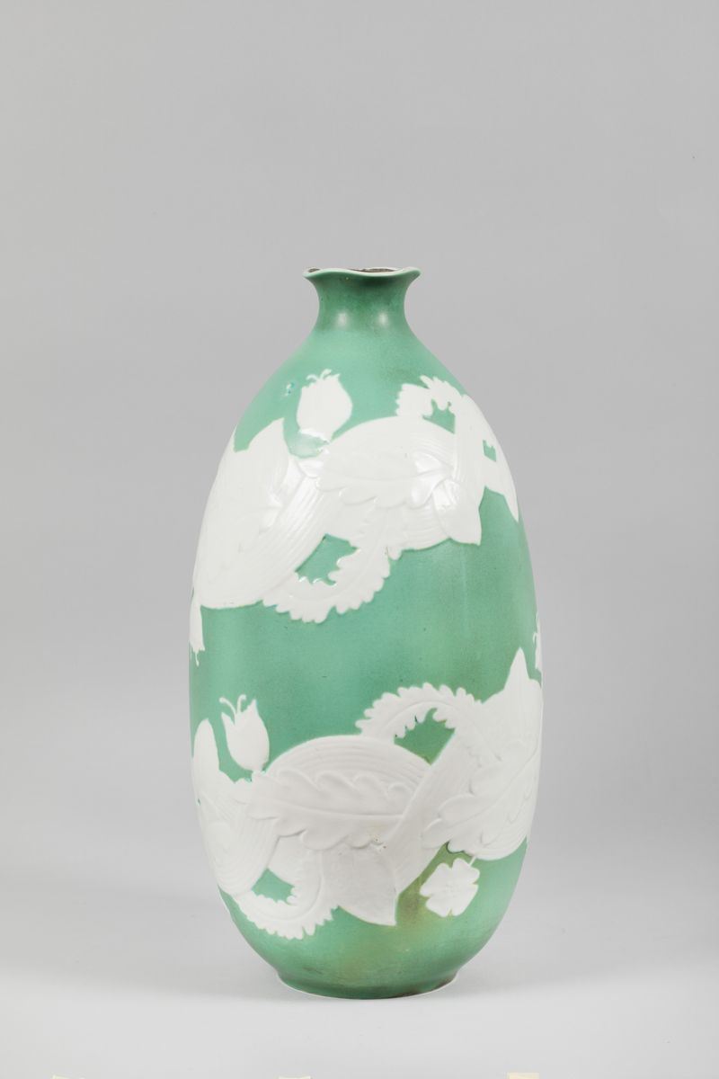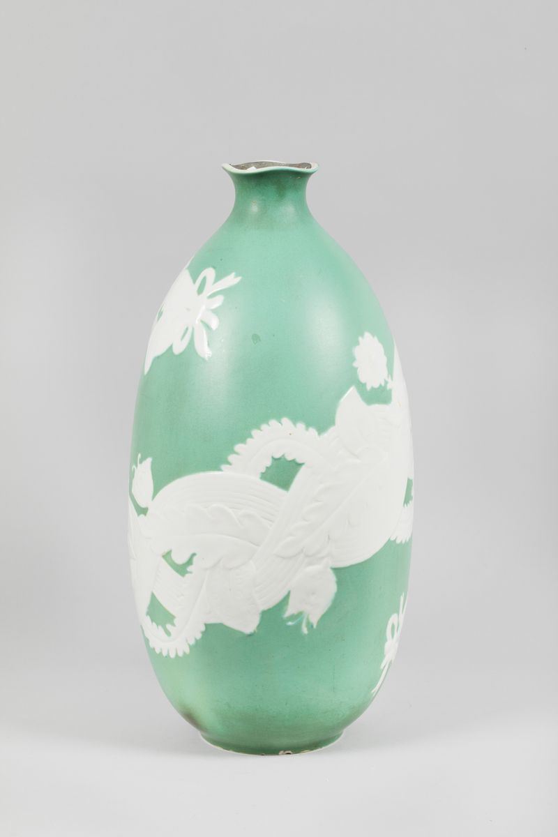 Grande vaso a uovo in terraglia a colaggio con decoro di festoni e fogliame in rilievo.