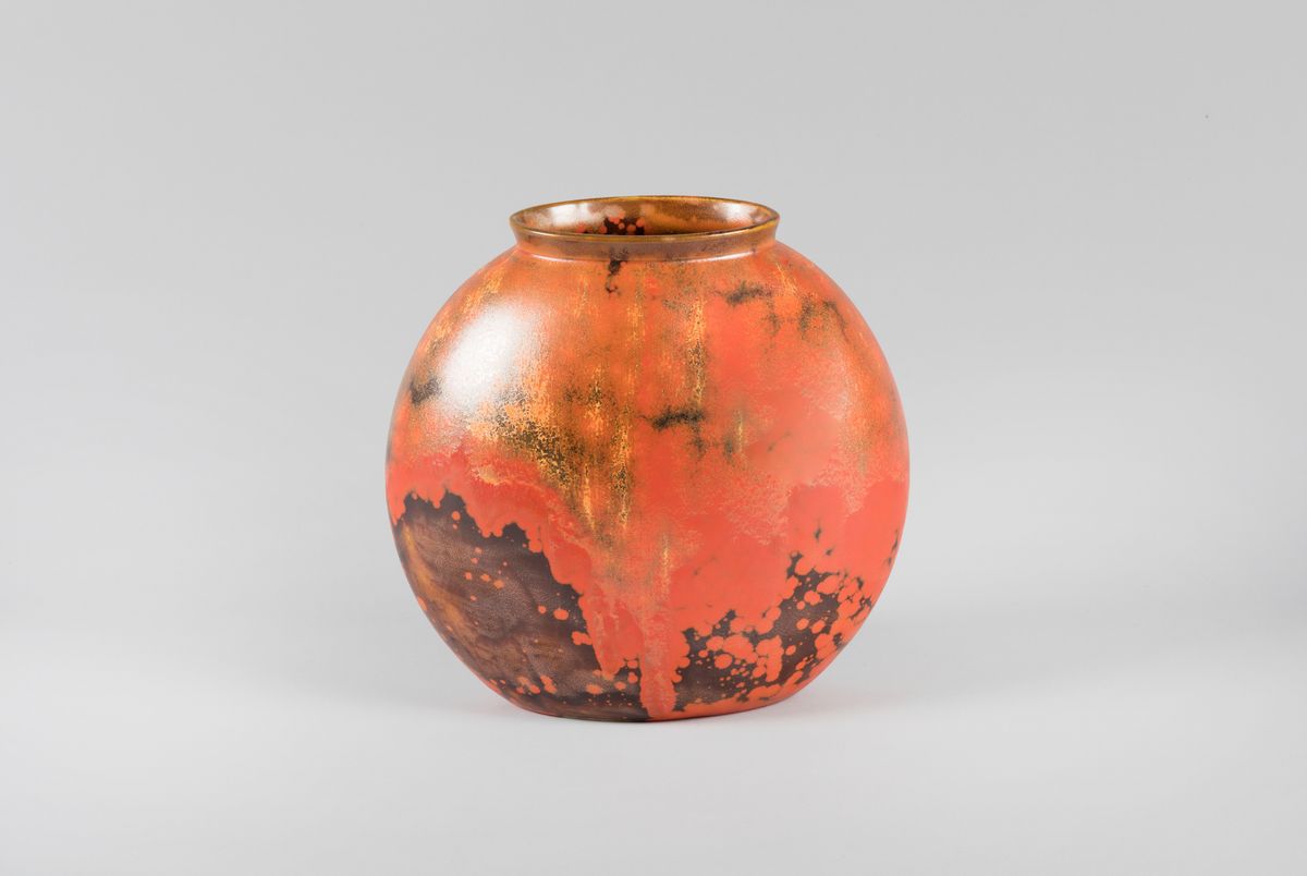 Grande vaso a lente con decoro di smalto marezzato nei colori dell'arancione.