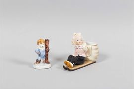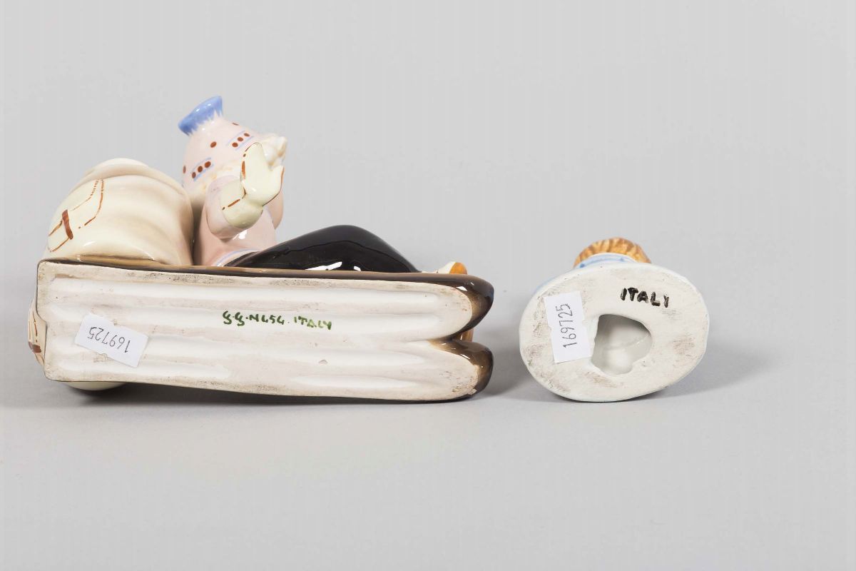 Vasetto in forma di zaino con sciatrice in terraglia a colaggio con decoro policromo ed un’altra figurina.