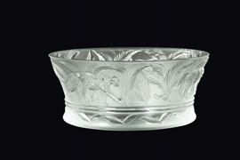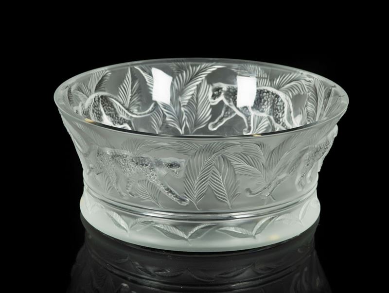 Grande coppa in cristallo sabbiato con fascia sabbiata con ghepardi in rilievo. Custodia originale.