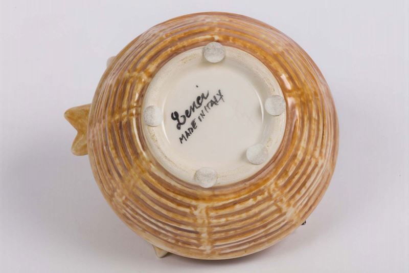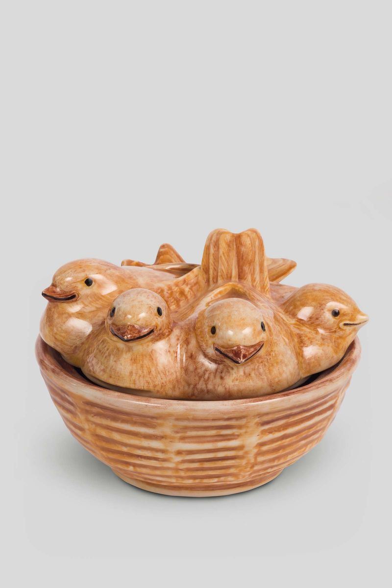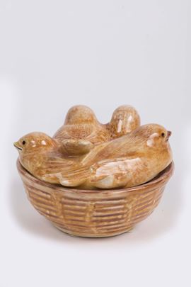 Scatola raffigurante uccelli che covano in terraglia a colaggio con decoro monocromo.