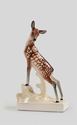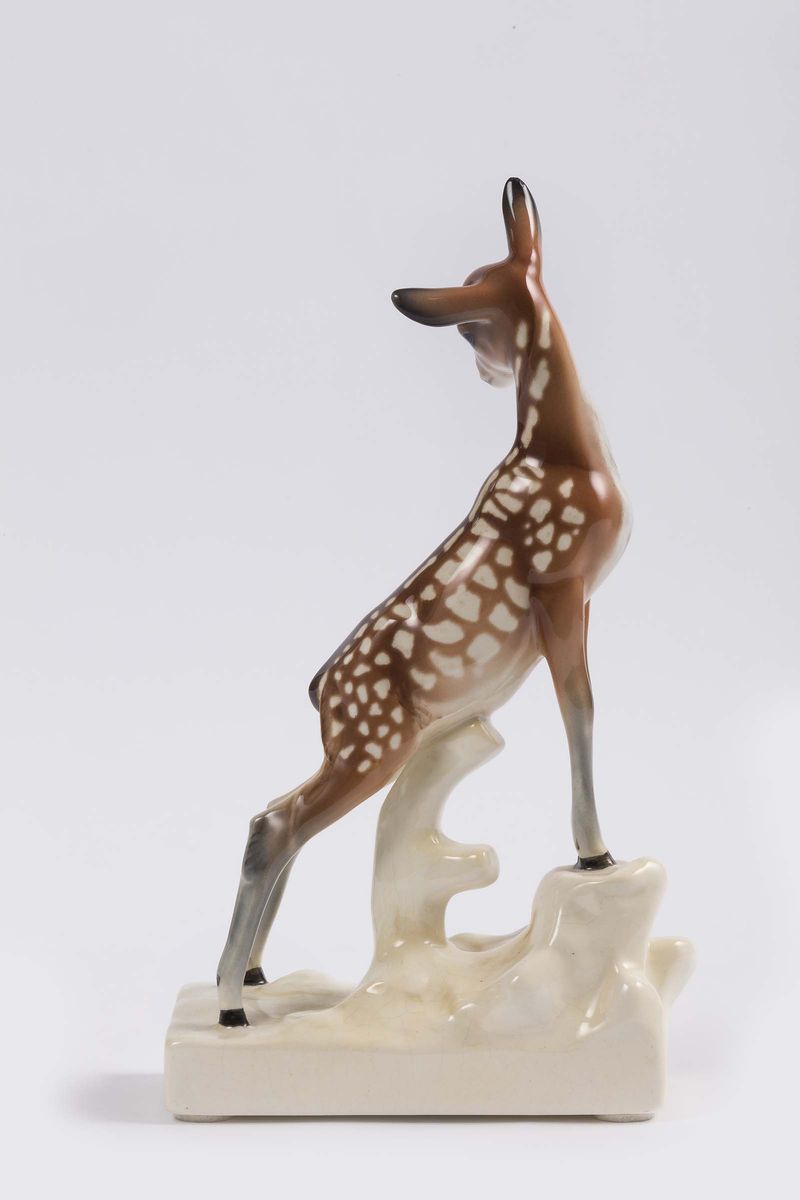 Figura di cerbiatto in terraglia a colaggio con decoro policromo.