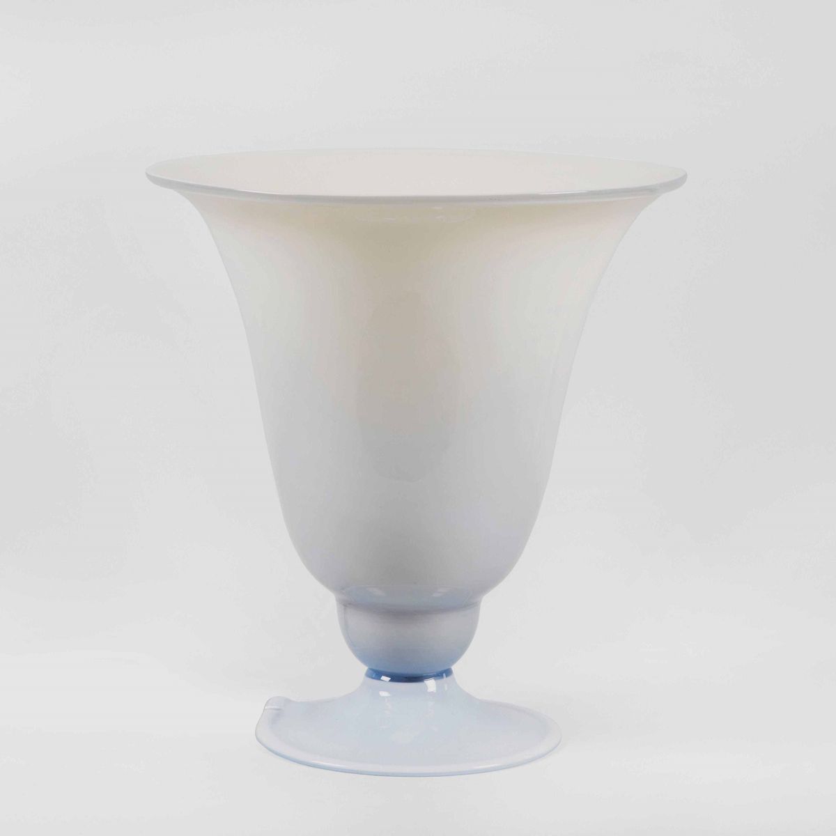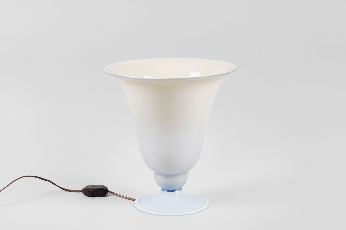 Lampada da tavolo a tromba rovesciata con piede espanso in vetro incamiciato lattimo azzurro.