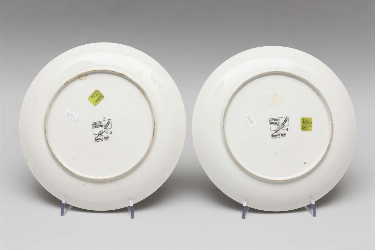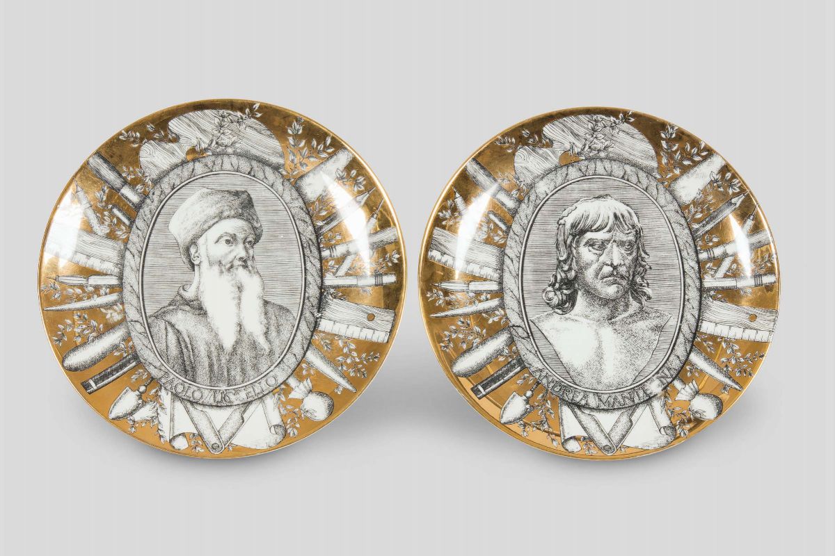 Coppia di piatti serie Pittori italiani decorati con ritratti e attrezzi da artista su fondo oro.
