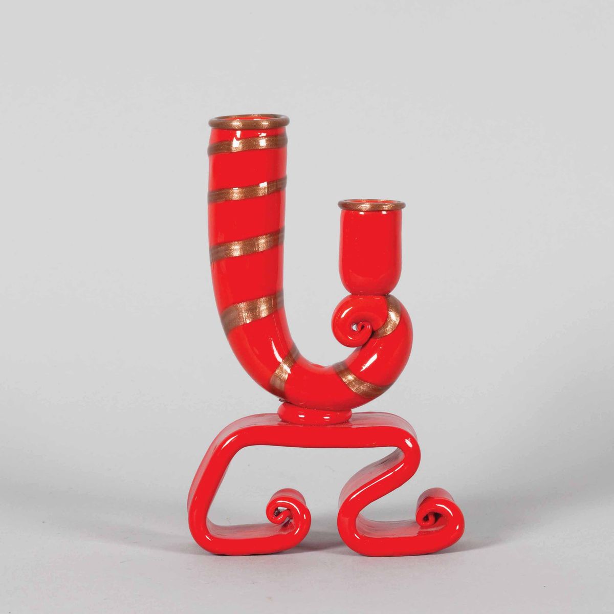 Candeliere in pasta vitrea rossa su basamento a onde con decoro a canne di avventurina.
