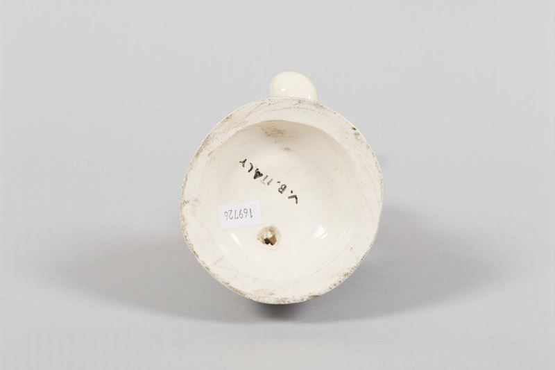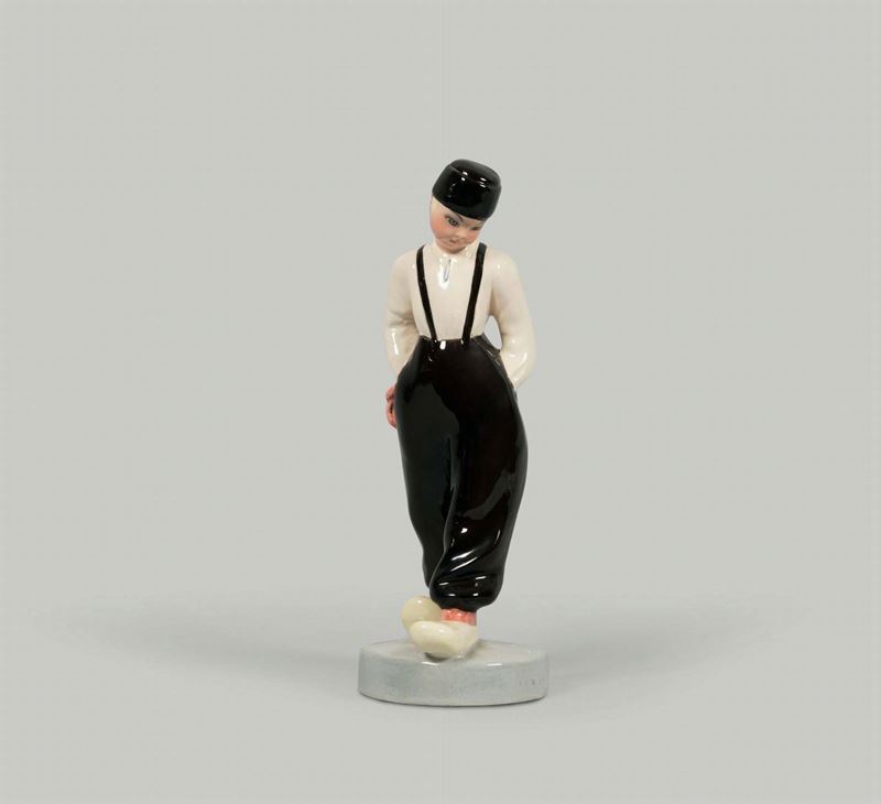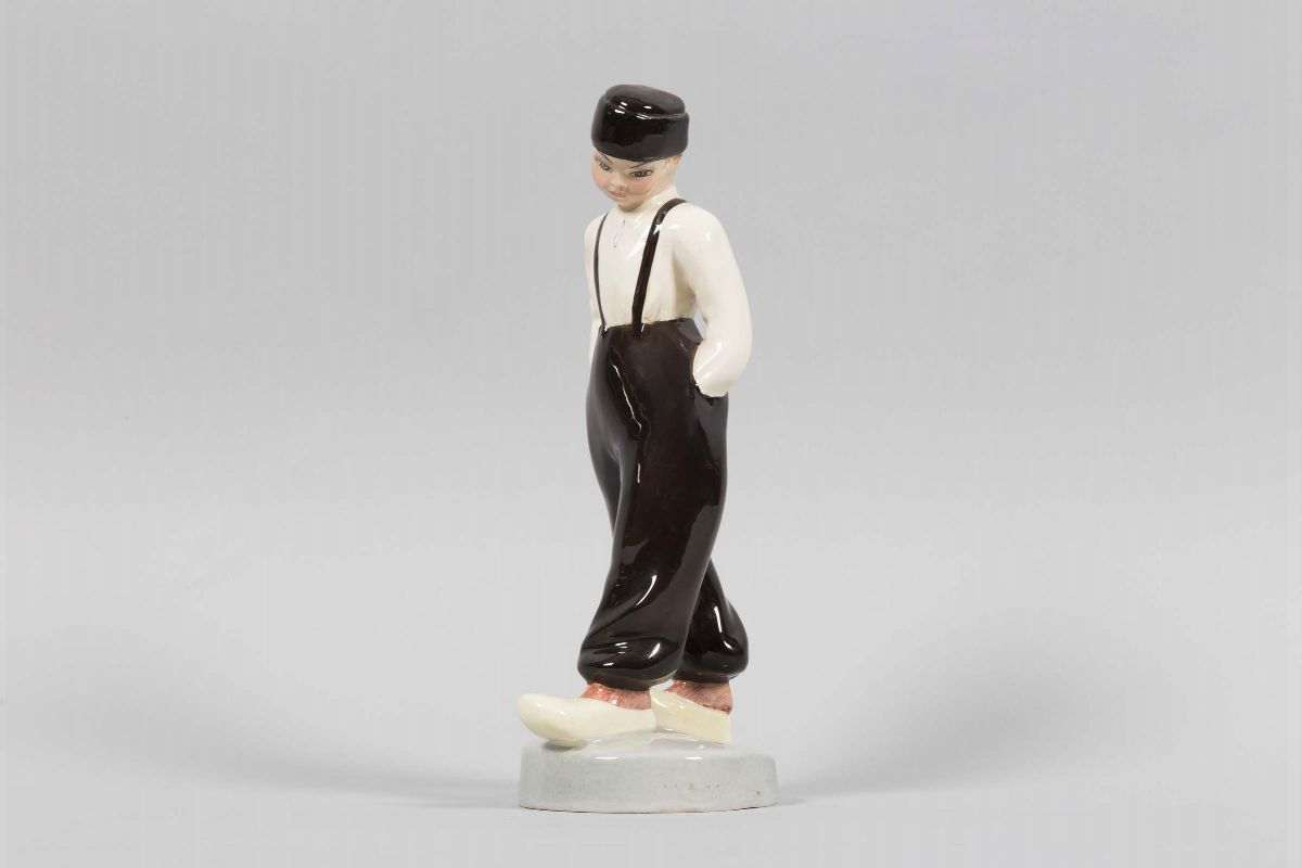 Figura di personaggio in terracotta maiolicata in policromia.