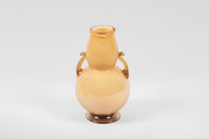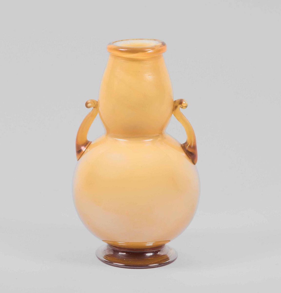 Piccolo vaso in forma di zucca in vetro lattimo incamiciato giallo oro con anse, piede e bocca applicati, superficie fortemente iridata.