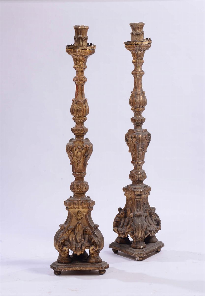 Coppia di candelieri in legno intagliato e dorato, XVIII secolo