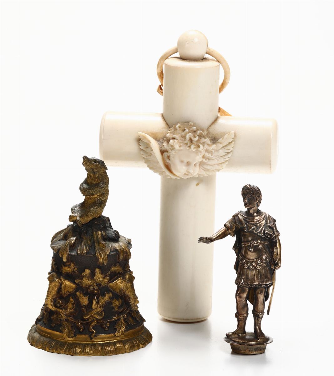 composto da insieme di croce in avorio, sigillo in bronzo di imperatore romano, campanello