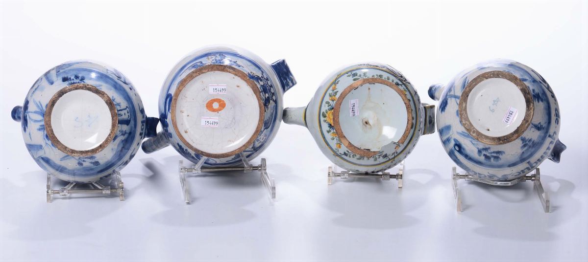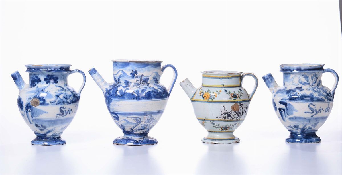 Maiolica in policromia e monocromia blu a gran fuoco. Varie altezzeDifettiCorpo piriforme, collo svasato, pippiolo a tubo. Base incavata.Decori floreali con paesaggi fantastici. Alcuni con iscrizioni farmaceutiche.