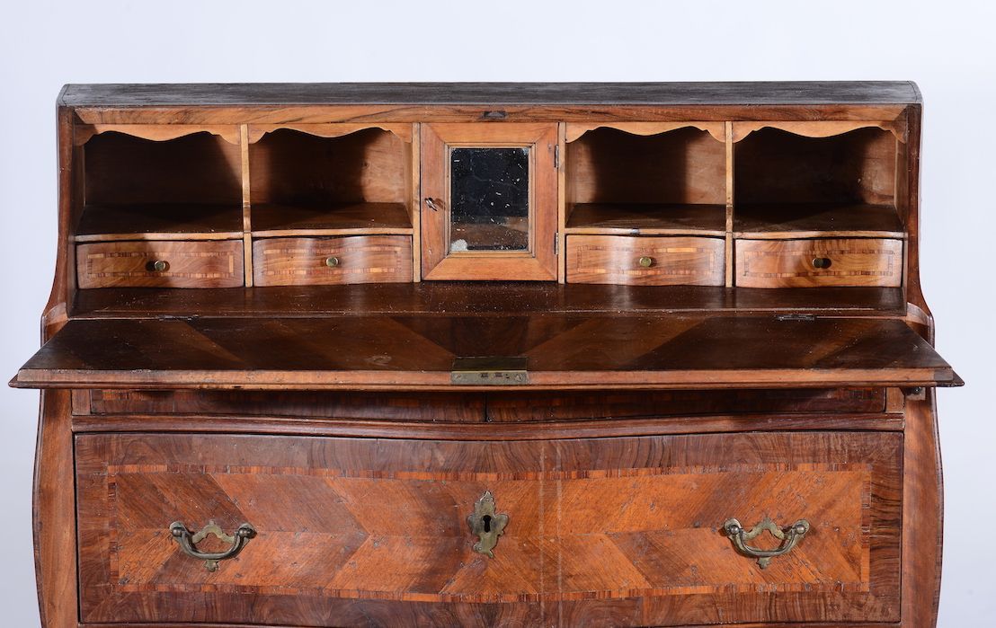fronte mosso a due cassetti più due cassettini affiancati sotto la calatoia che cela cassettini, vani a giorno ad antina centrale a specchio, cm 105x48x102 (difetti e sostituzioni)