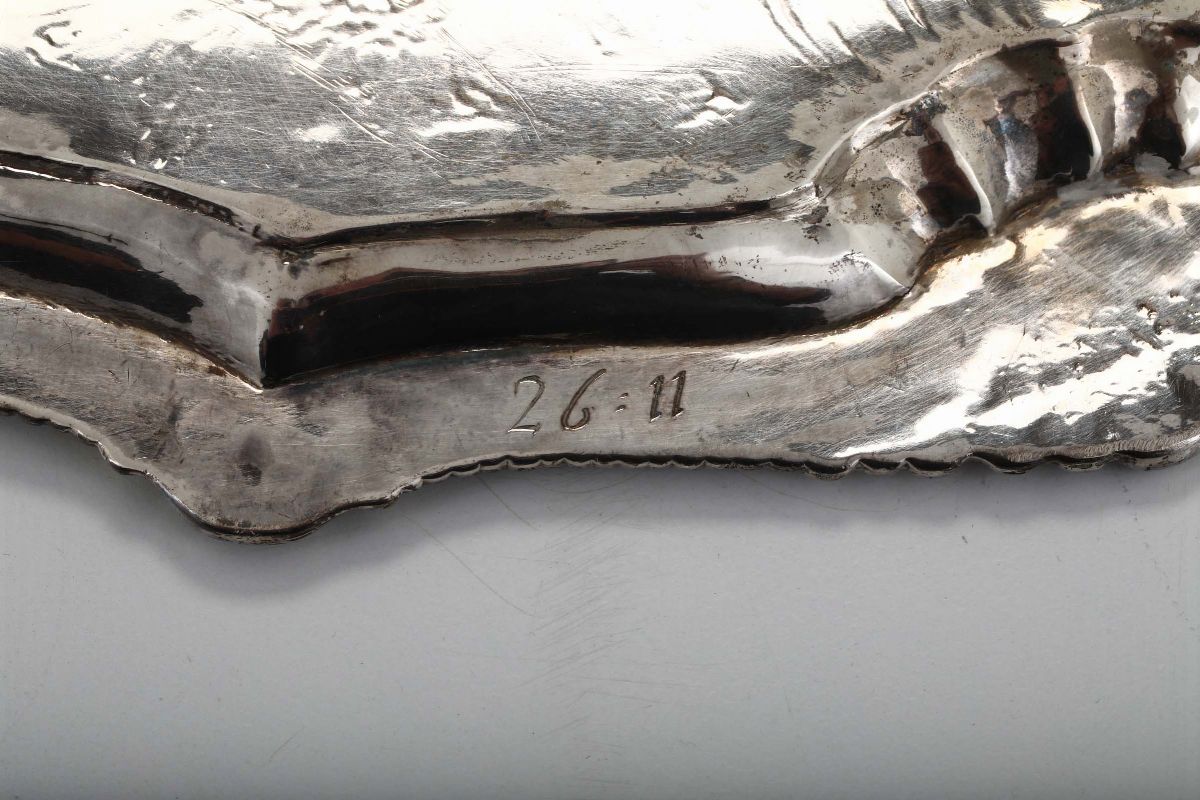 decoro centrale inciso con stemma nobiliare entro riserva a volute fogliacee e motivi floreali, diametro cm 30, gr. 730