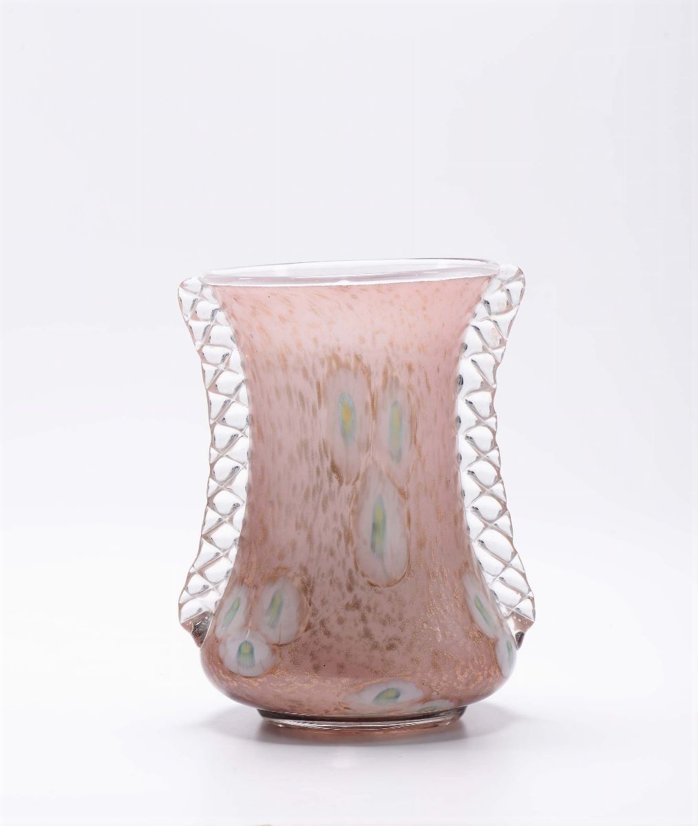 Vaso in vetro di Murano con manici rosato con tracce di doratura