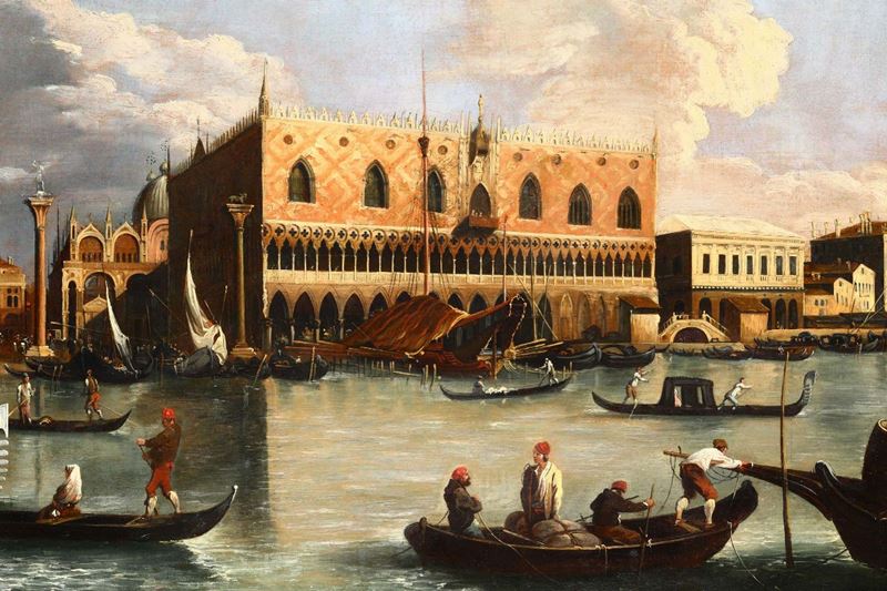 Perizia di Dario Succi: La splendida visione panoramica del Molo, ripresa da un punto di vista situato nel bacino di San Marco, fu uno dei soggetti più replicati e amati da Antonio Canal detto il Canaletto (Venezia 1697 - 1768) nel corso della sua lunga carriera artistica. La veduta infatti dispiega davanti agli occhi dell'osservatore la parte monumentale più significativa della Repubblica Serenissima, con la sfilata di prestigiosi palazzo che costituivano il simbolo del potere centrale dello stato. Partendo da sinistra è visibile l'edificio della Zecca cui fanno seguito la Libreria Marciana sovrastata dal campanile, le due colonne della Piazzetta con San Teodoro e il Leone, la Torre dell'Orologio a la basilica di San Marco sullo sfondo, il Palazzo Ducale e le Prigioni. La prima versione di questa veduta è individuabile nel celebre dipinto raffigurante Il ritorno del Bucintoro da San Nicolò del Lido nel giorno della festa dell'Ascensione che fu eseguito nel 1.734 a conclusione della serie di quattordici vedute commissionata da Joseph Smith, il famoso conoscitore e patron di Canaletto. La serie fu incisa da Antonio Visentini e pubblicata per la prima volta nel 1735 nella raccolta di acqueforti intitolata Prospectus Magni Canalis Venetiarum, la cui ultima tavola raffigura proprio la veduta con il Bucintoro davanti al Palazzo Ducale. La serie di vedute fu acquistata, insieme alla maggior parte delle raccolte smithiane, nel 1762 dal re d'Inghilterra e da allora fa parte della Royal Collection ed é esposta nella residenza di Windsor Castle. Una veduta prospetticamente simile, ma senza la presenza del Bucintoro, fu eseguita da Canaletto negli anni trenta per il Duca di Bedford e fa parte di una straordinaria serie di ventiquattro vedute veneziane ubicate a Woburn Abbey. Un'altra versione è conservata a Firenze nella Galleria degli Uffizi (Constable, Canaletto, n. 102; 51x83 cm) dove pervenne nel 1796 dalla residenza medicea del Poggio Imperiale. Il dipinto è databile su basi stilistiche agli anni quaranta del Settecento, prima della partenza di Canaletto per l'Inghilterra avvenuta nel 1746: la datazione riceve conferma dalla mancanza della sopraelevazione della Torre dell'Orologio, visibile sullo sfondo, che, progettata dall'architetto Giorgio Massari, sarà portata a compimento alla metà del sesto decennio. Il dipinto qui considerata si caratterizza per una impostazione prospettica identica a quella della versione museale. Le analogie si estendono alle imbarcazione, alle figure ed alla generale affinità cromatica, oltre che alle dimensioni. La veduta, caratterizzata da un notevole livello esecutivo, è attribuibile ad un valido seguace di Canaletto che ha saputo rendere con grande abilità le caratteristiche dello stile e dell'atmosfera della veduta conservata agli Uffizi. Dario Succi