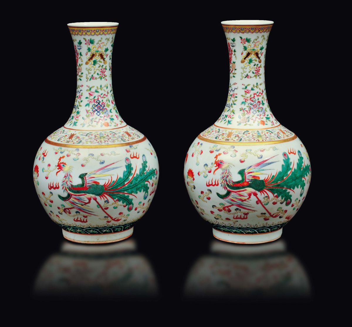 Coppia di vasi a bottiglia in porcellana a smalti policromi con decoro di dragone e feinice, Cina, Dinastia Qing, marchio e del periodo Guangxu (1875-1908)