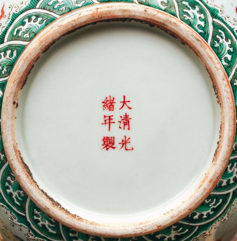 Coppia di vasi a bottiglia in porcellana a smalti policromi con decoro di dragone e feinice, Cina, Dinastia Qing, marchio [..]