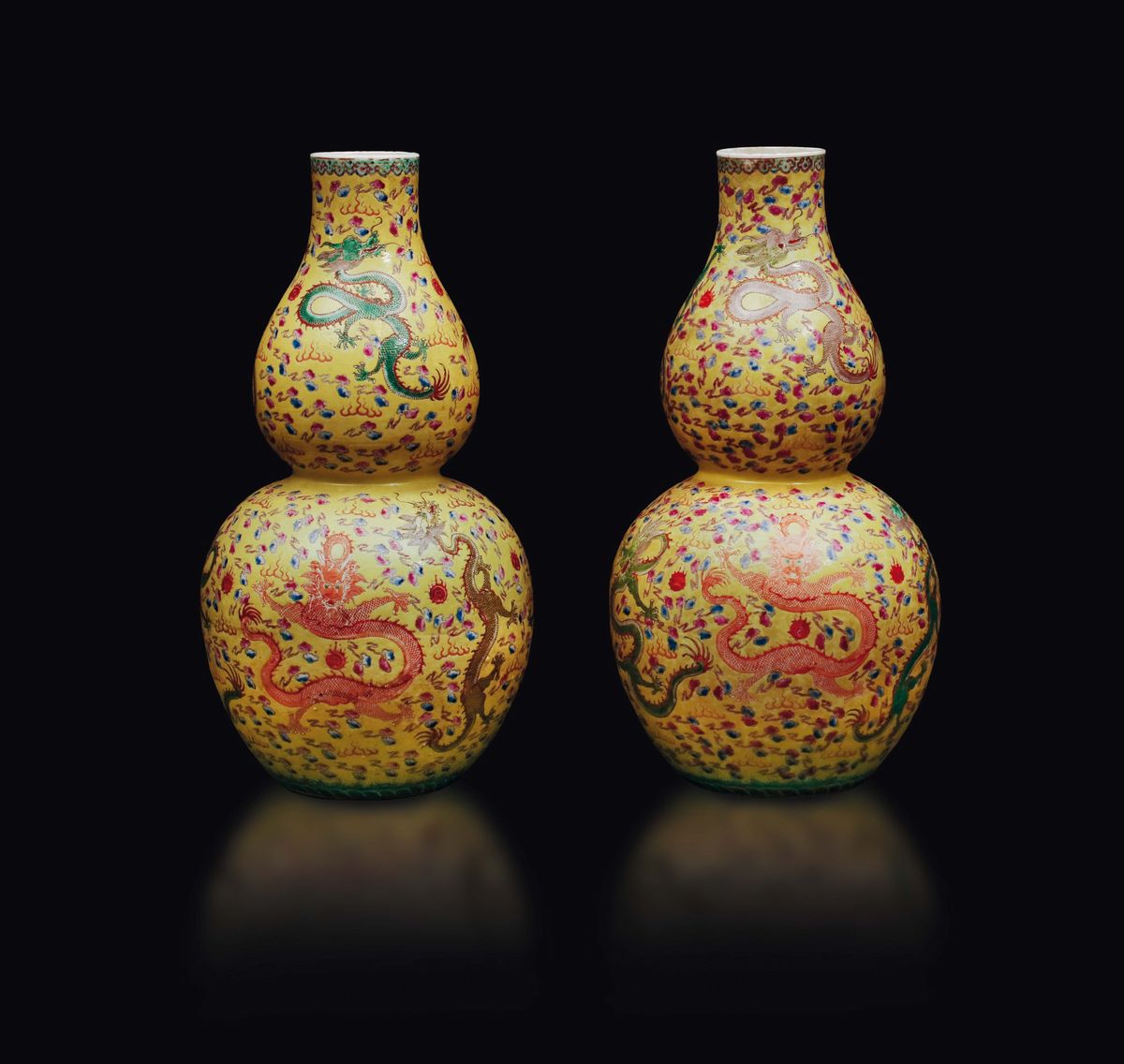 Coppia di vasi a doppia zucca in porcellana a fondo giallo con raffigurazione di dragoni tra le nuvole, Cina, inizio XX [..]