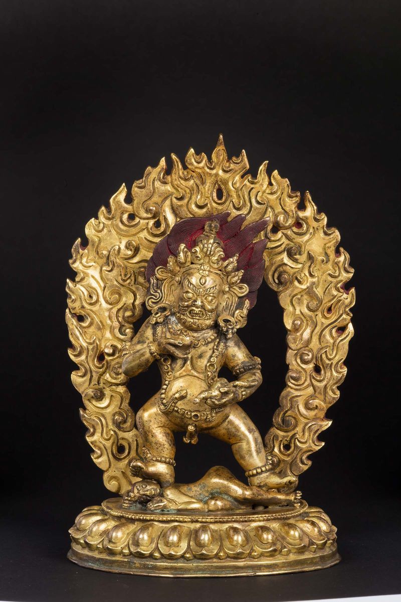 Figura di EkaviraMahakala in bronzo dorato con aura, Tibet, XVII secolo