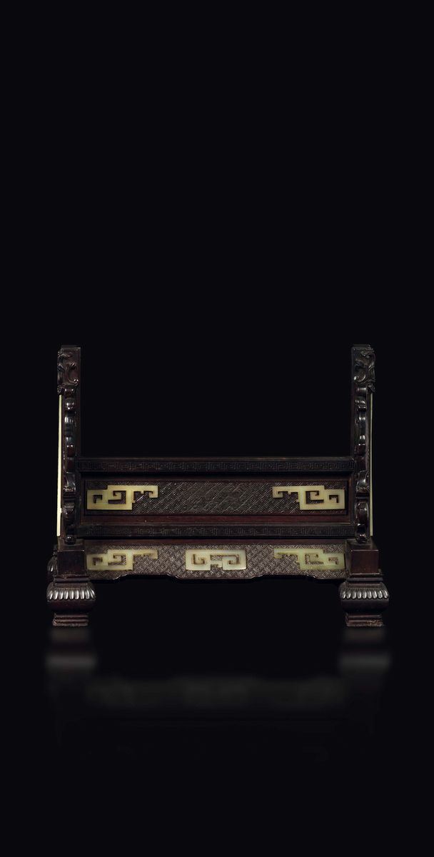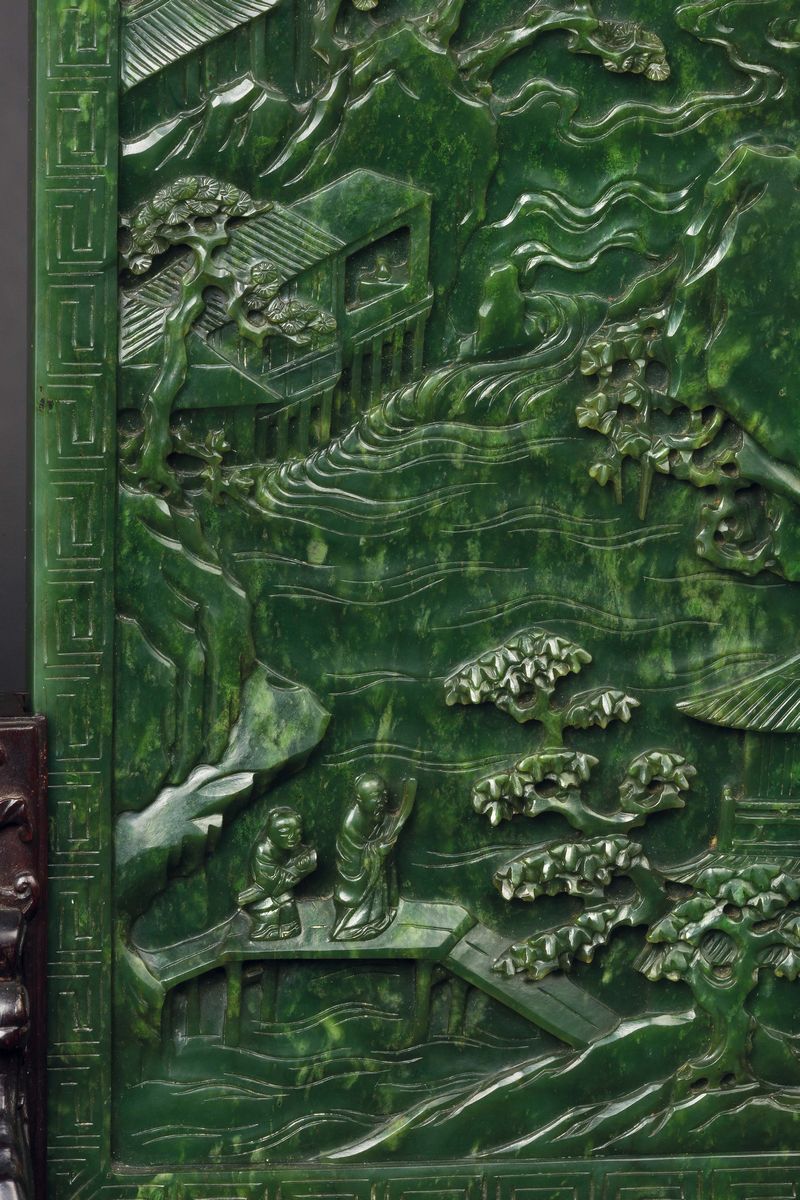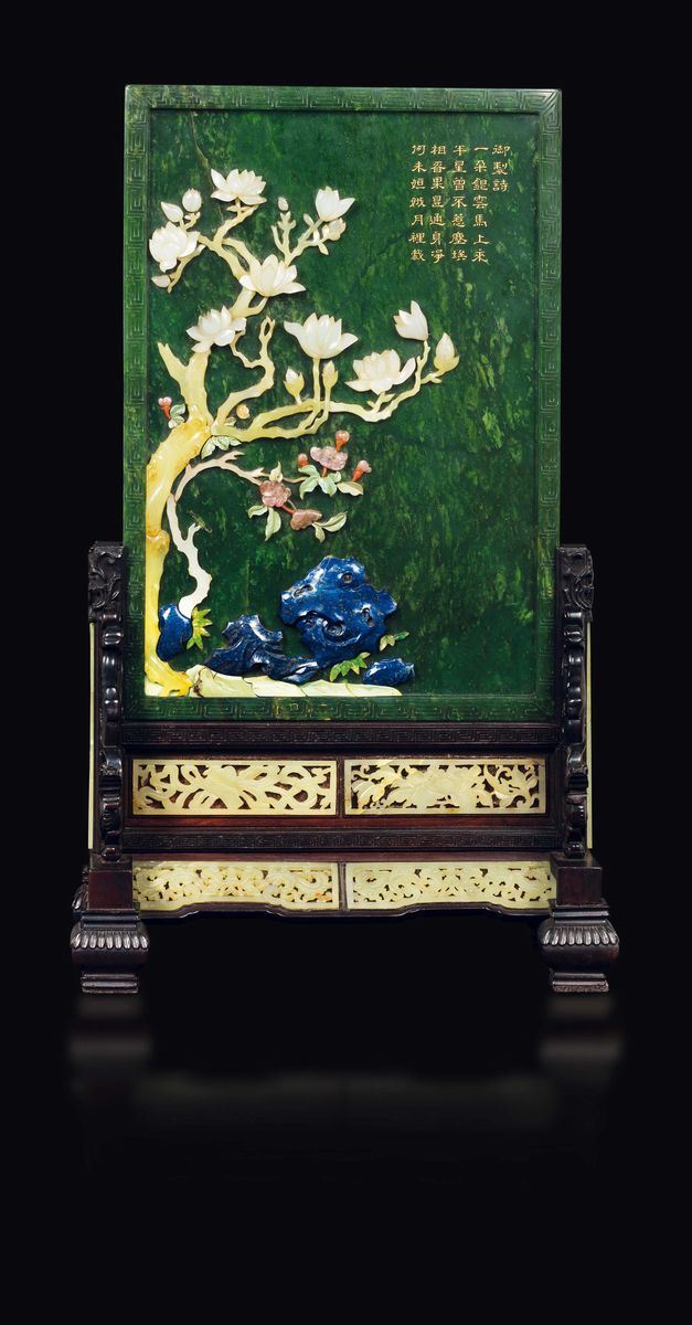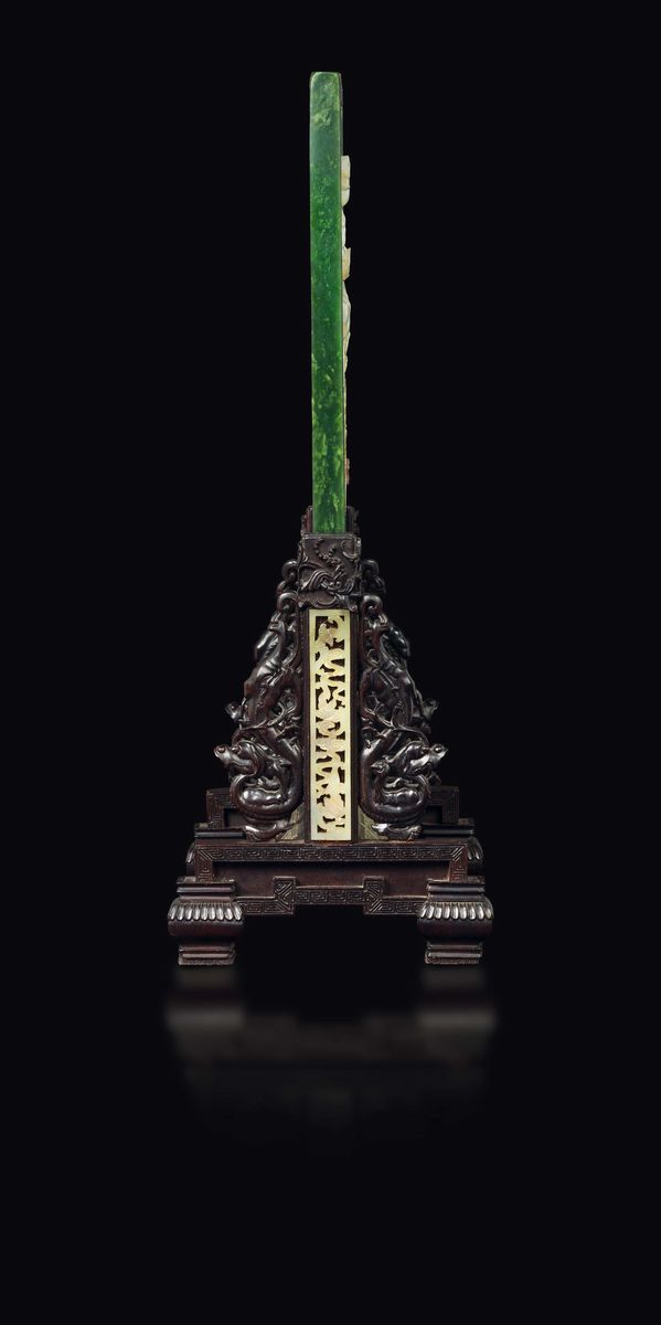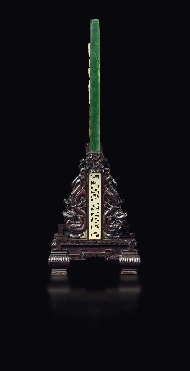 Grande ed Imperiale paravento da tavolo con placca in giada spinacio con paesaggio, poesia ed innesti in giada gialla, base in legno di zitan, Cina, Dinastia Qing, epoca Qianlong (1736-1795)