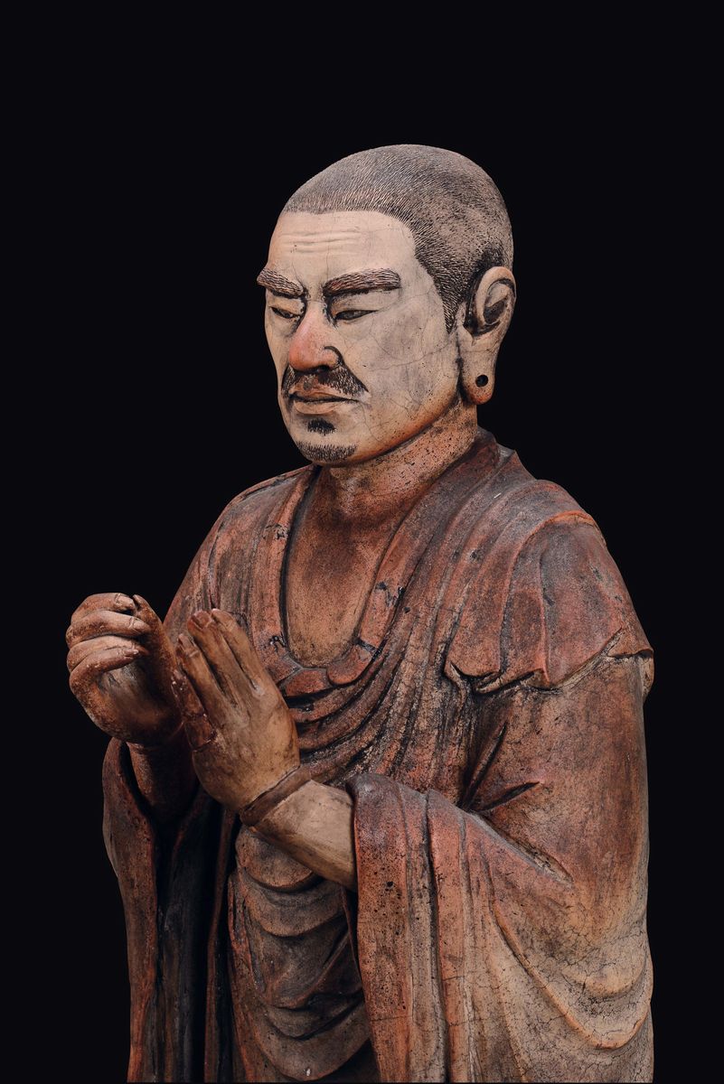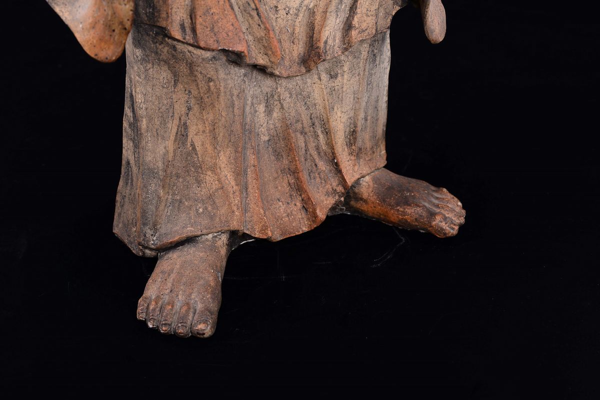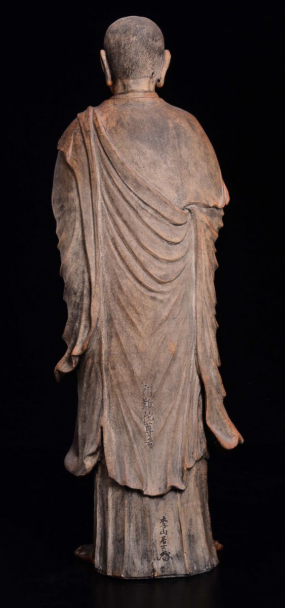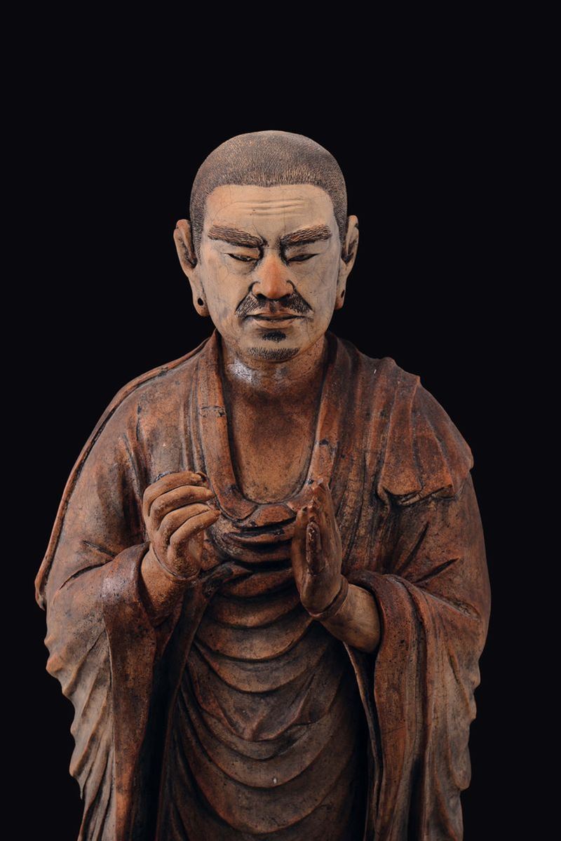 Grande figura di Ananda eretto in terracotta dipinta con iscrizione sul retro, Giappone, XIX secolo