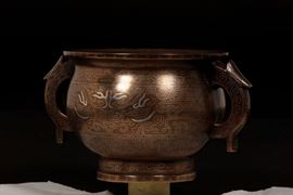 Incensiere in bronzo con decoro d'ispirazione arcaica con maschera taotie in intarsio d'argento , Cina, Dinastia Ming, XVII secolo